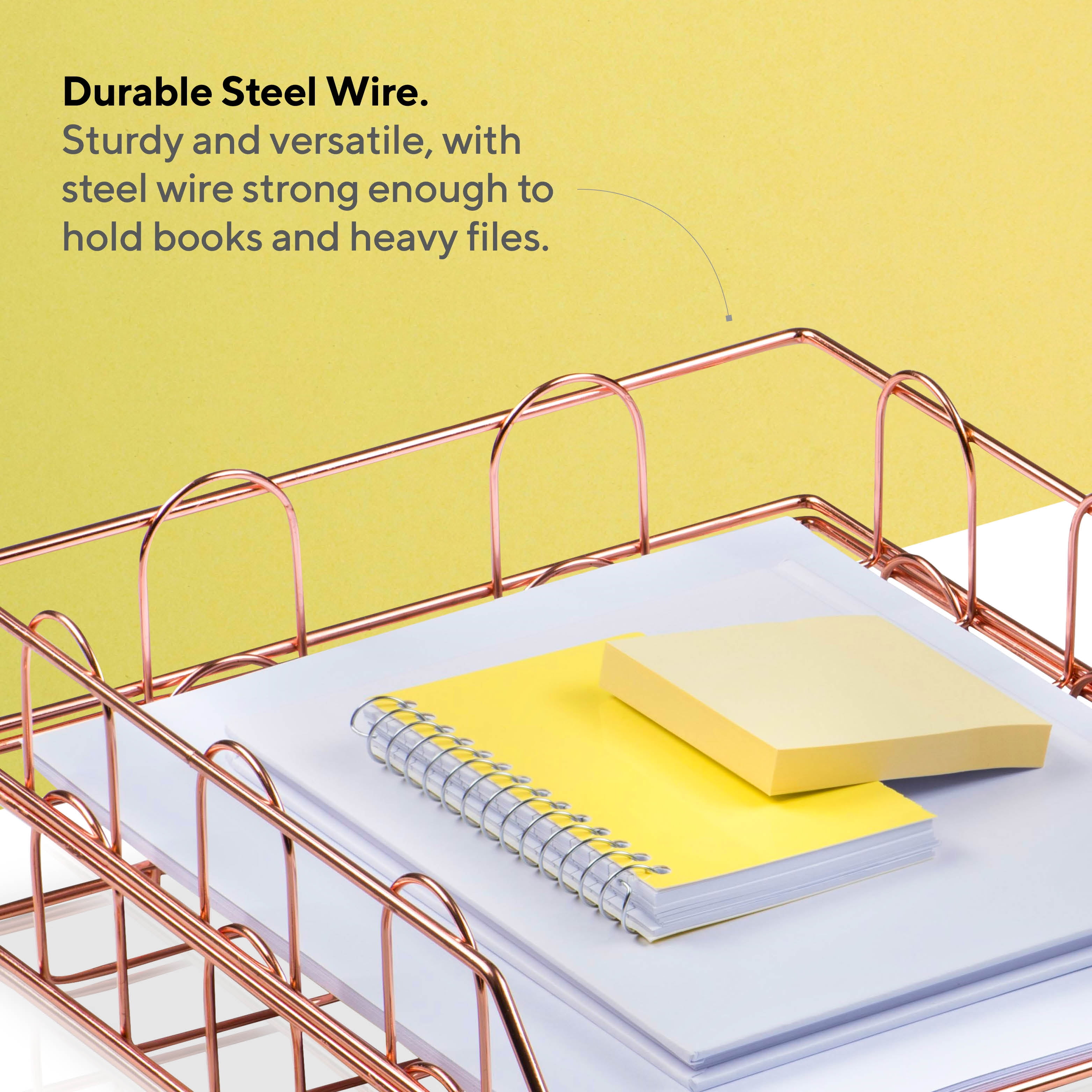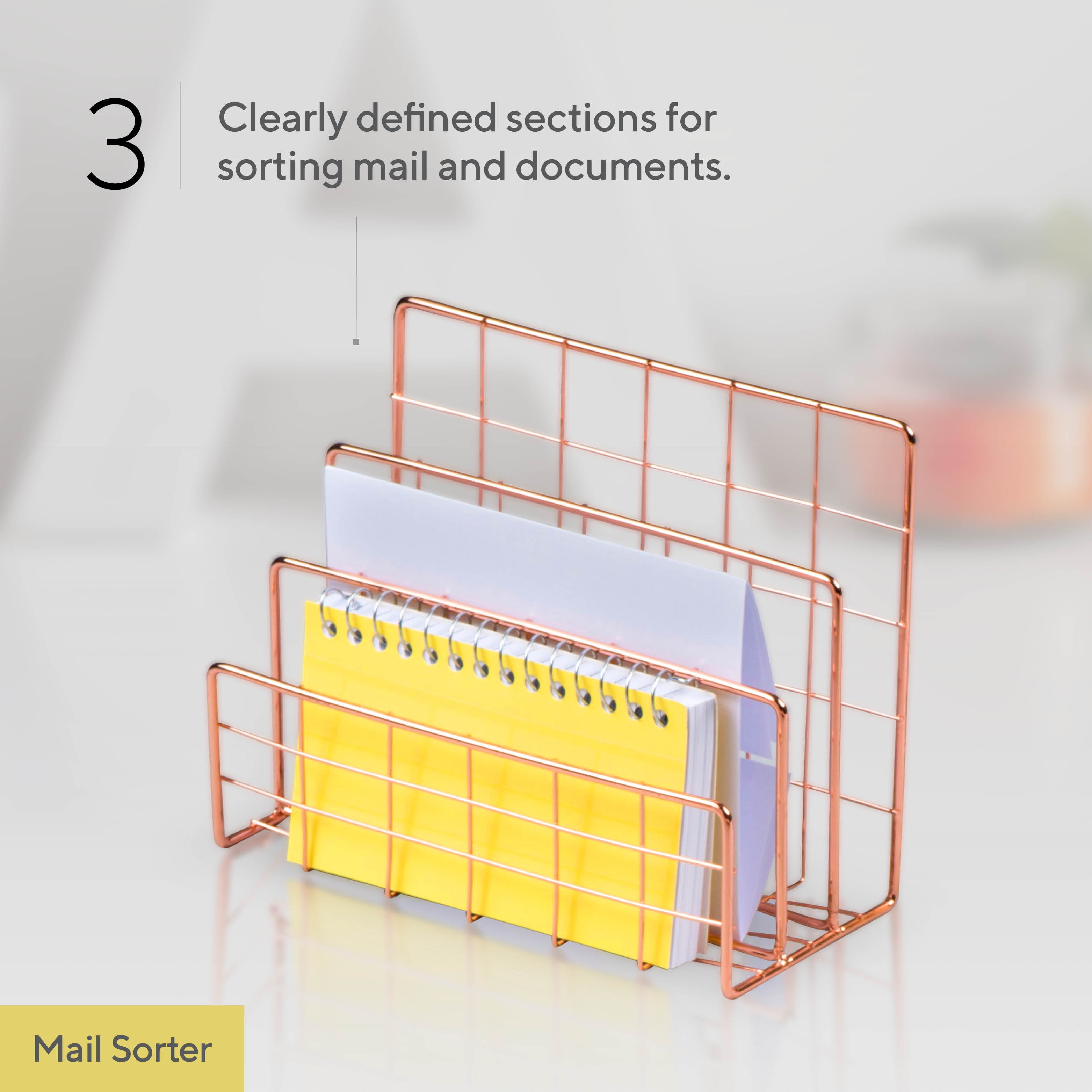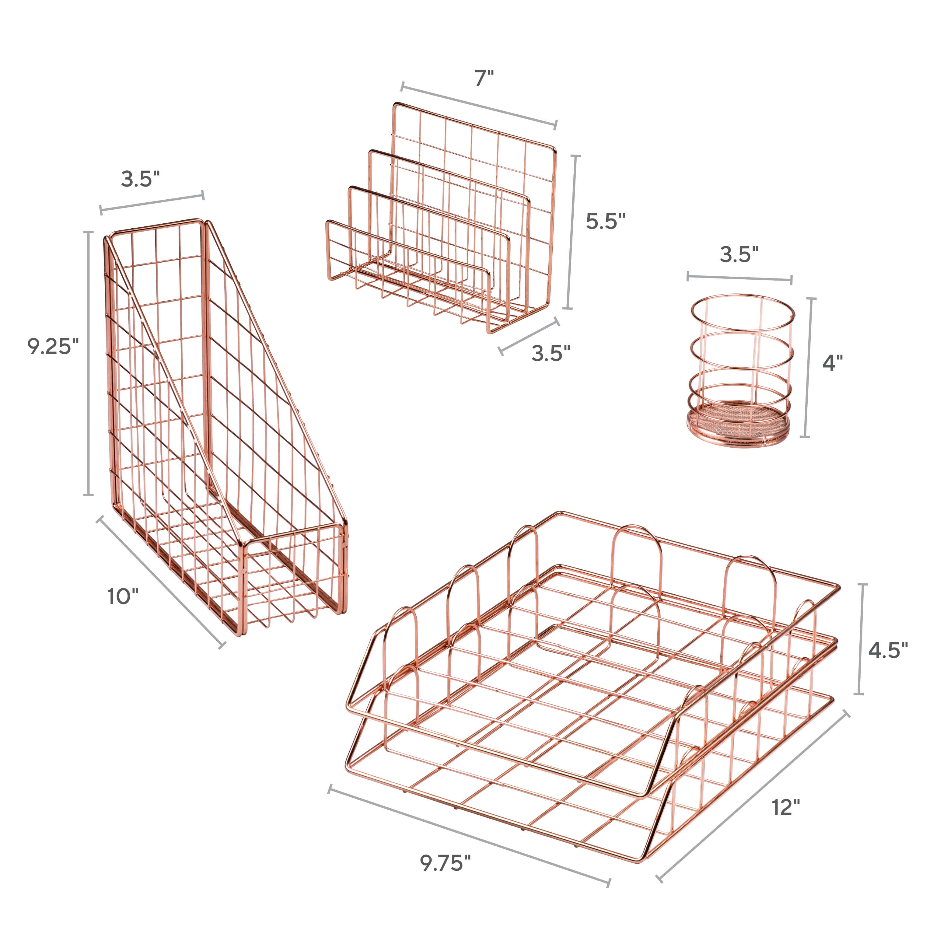 - YOU NEED SPACE: We’re all about space. Our office desk organizer set includes a magazine file holder, mail sorter, pen cup and 2 stackable letter trays, all constructed with durable steel wire strong enough to support heavy files and books. Bonus: assortment of rose gold binder clips and paper clips included.