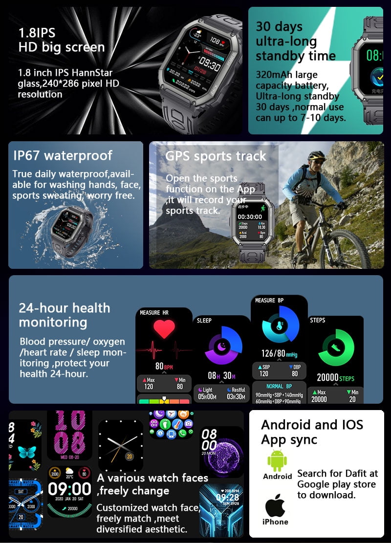 - 【Smartwatch for Android iOS phones】 You only need to download the "Da Fit" app on your smartphone. Our smart watch is compatible with Android 6.0 and iOS 9.0 and higher, and is compatible with the device through "Da Fit" Connect, you can get phone reminders and SNS information in real time. More practical tools: weather forecast, music control, timer, alarm, sedentary reminder, breathing training, theater mod
