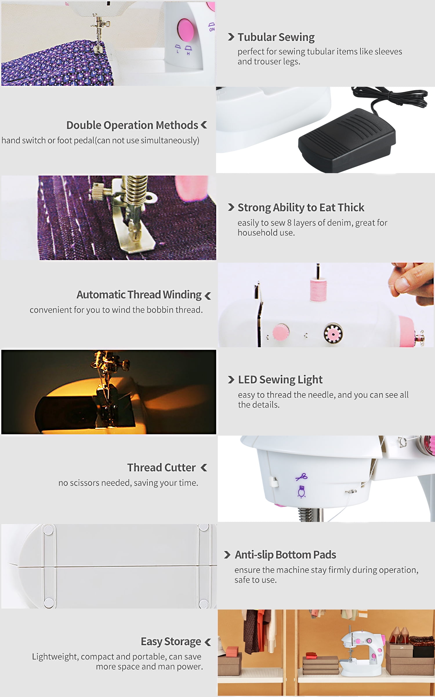 Mini Portable Sewing Machine —- The household sewing machine is designed to be Light and Compact. It can be placed anywhere without taking up space. It is an ideal sewing machine for home, travel, emergency.