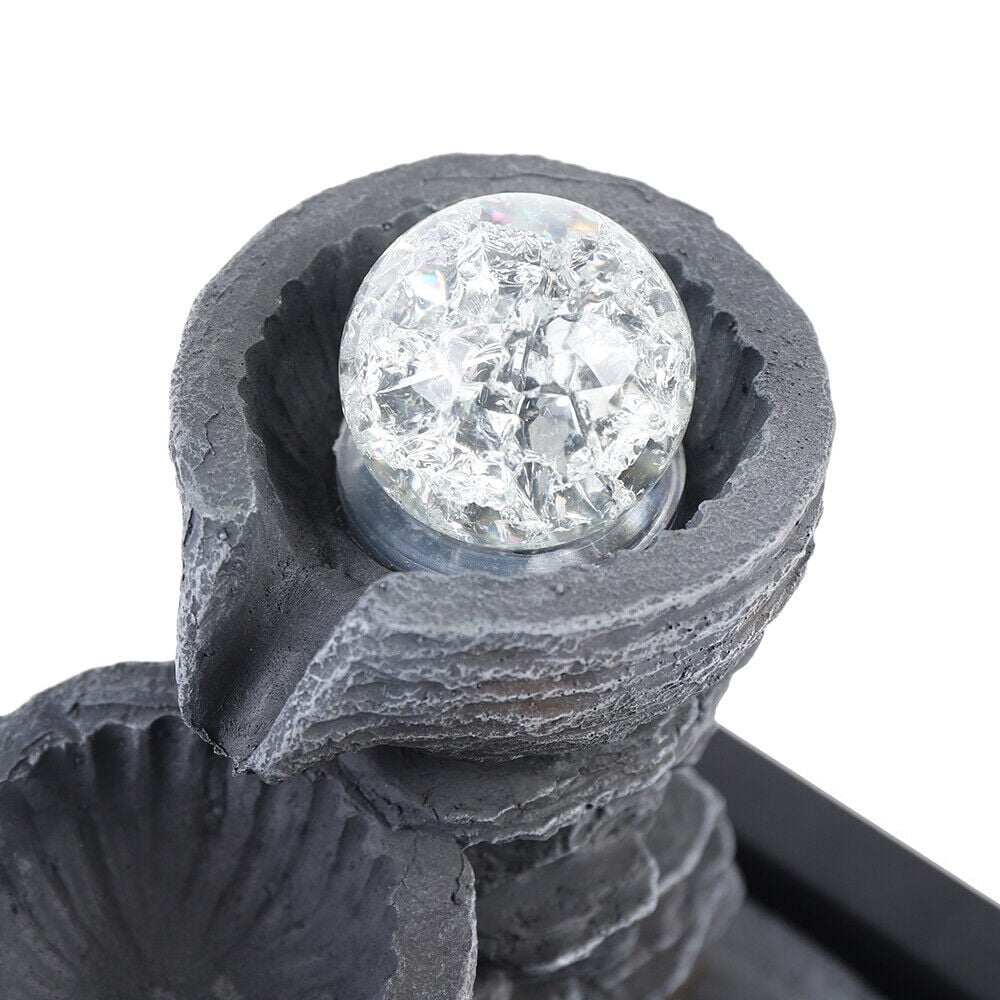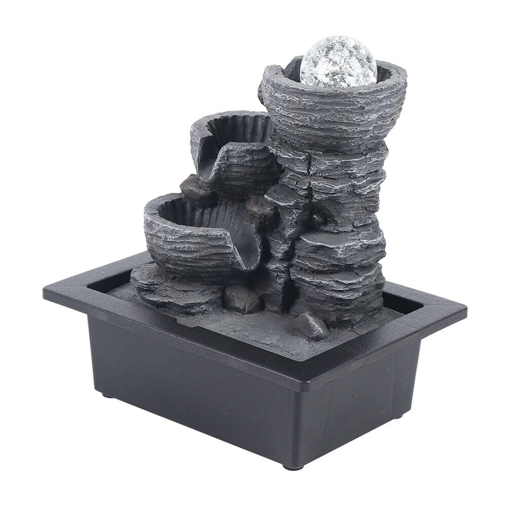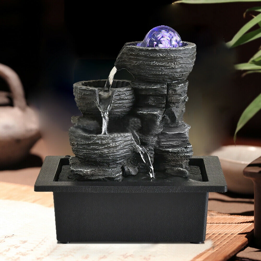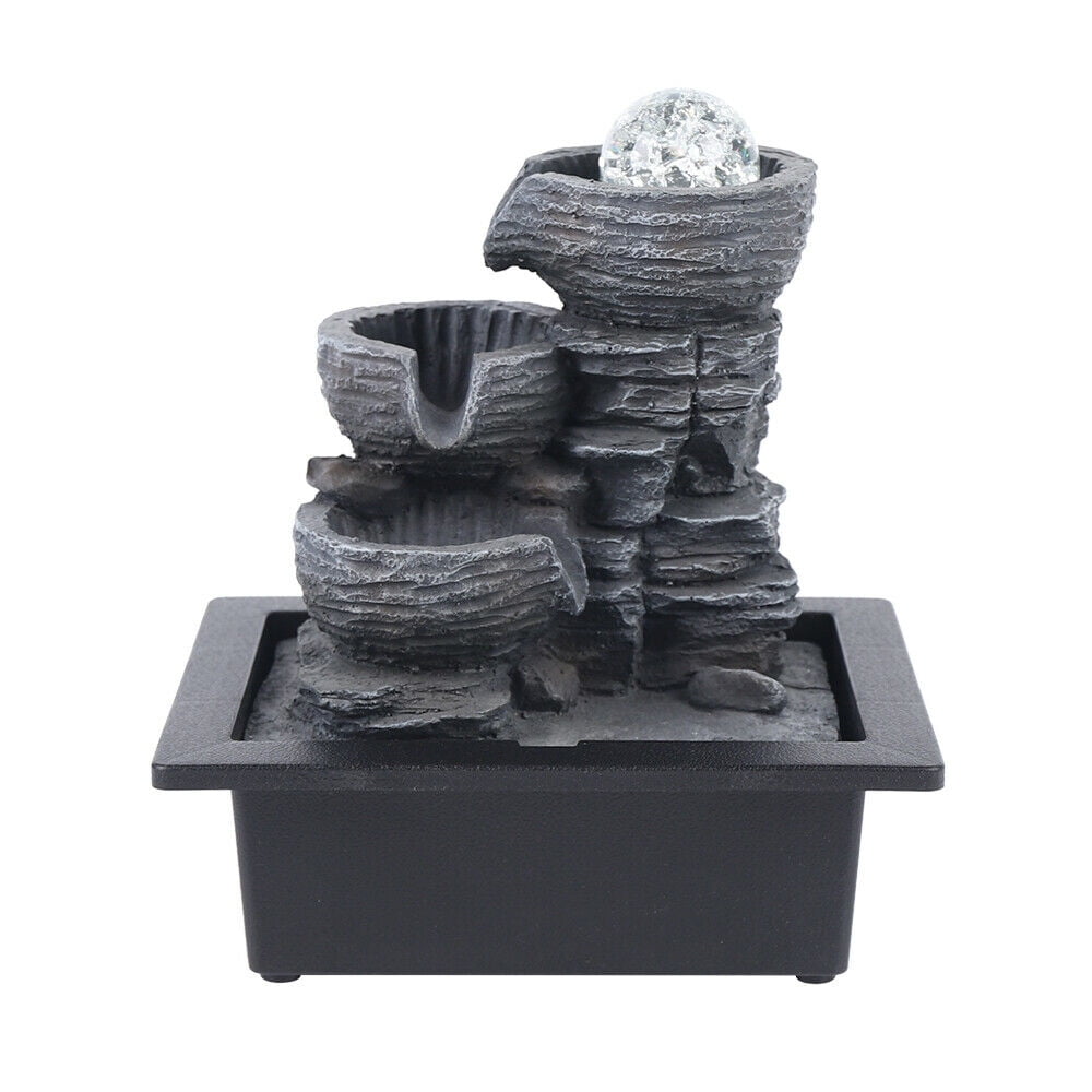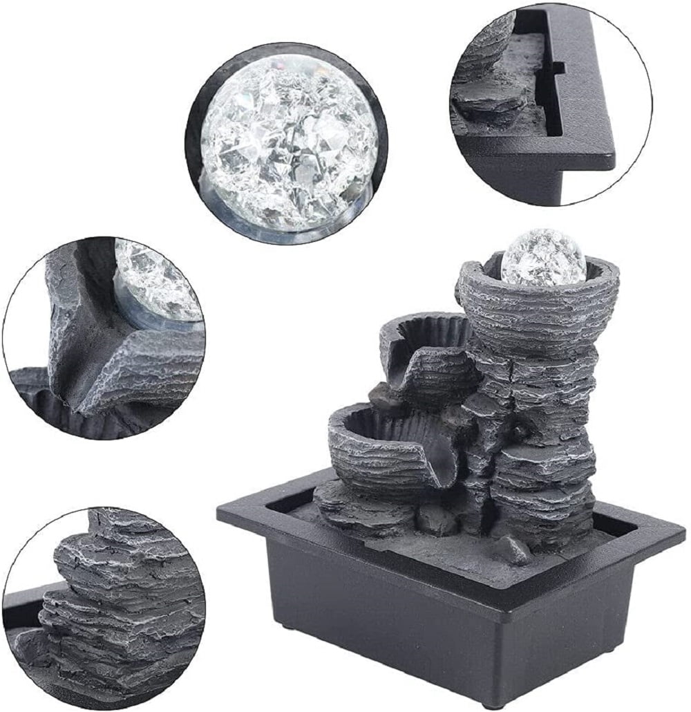 An indoor or outdoor fountain is a great accessory for a home office or study, or can look stunning as a unique addition to a living room mantel or bookshelf. There are sounds and sights of water flowing gently, soothing naturally. This water feature can be used indoors or outdoors to help create a feeling of calm and relaxation. Made of resin structure to ensure the durability of the tabletop fountain. A well-designed matte textured base elevates modern home decor interior fountain decorations. Easy to install, no additional plumbing required. You can assemble and then fill with water, submerge the pump completely, and connect it to a standard outlet. LED lights make it very attractive at night. Water flows from the top bowl to the bottom bowl. Colorful lights and man-made landscaping make tabletop fountains perfect for decoration.