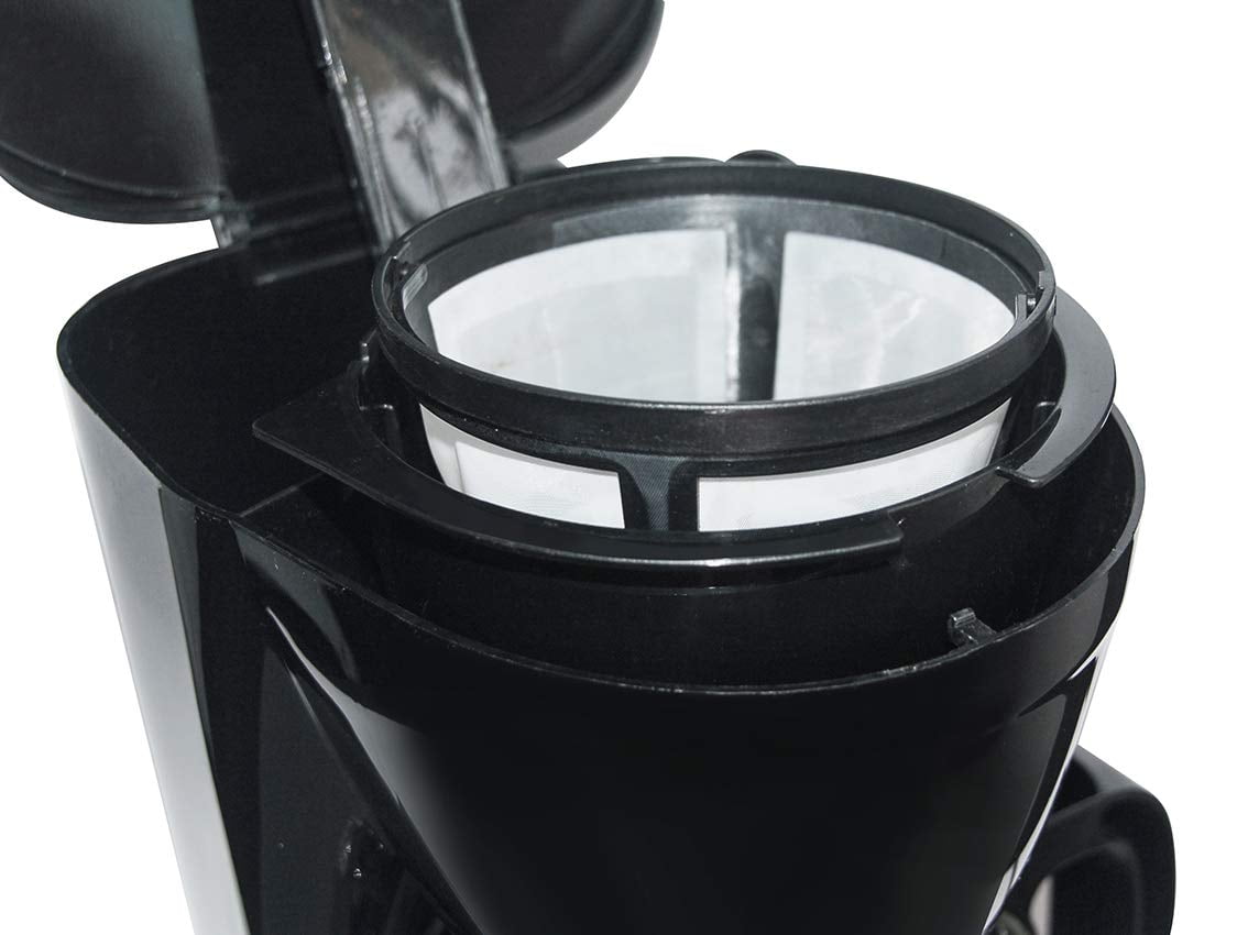 - COFFEE POT MAKER – 12 Cup Drip Coffeemaker with illuminated One-touch button On / Off Switch. With Glass Carafe. Including reusable filter and removable basket filter for the Coffee grounds of your choice and for easy cleaning.