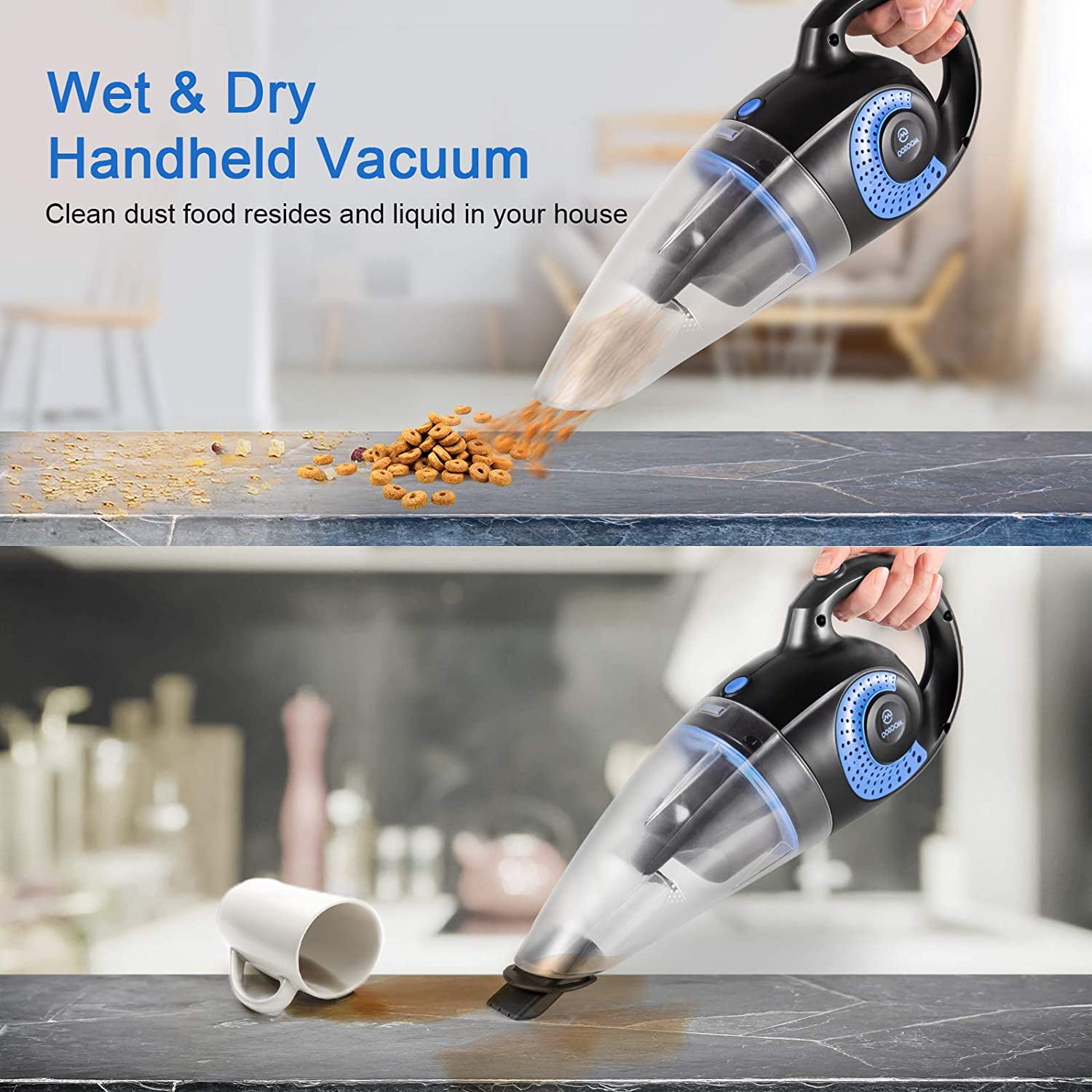 – Wet & dry hand vacuum adopts an advanced motor that provides suction up to 8500Pa, and effortlessly picks up debris, liquid, crumbs, and pet hairs in a minute.