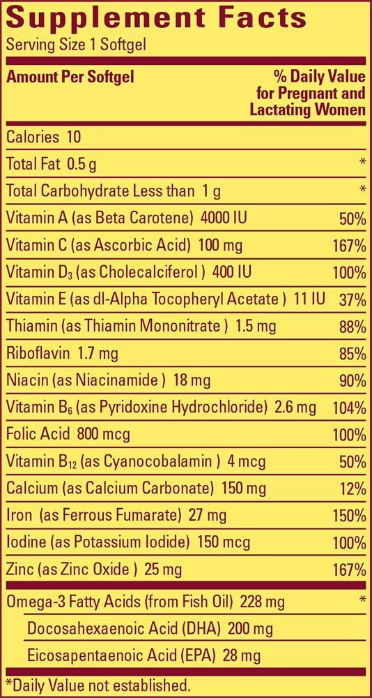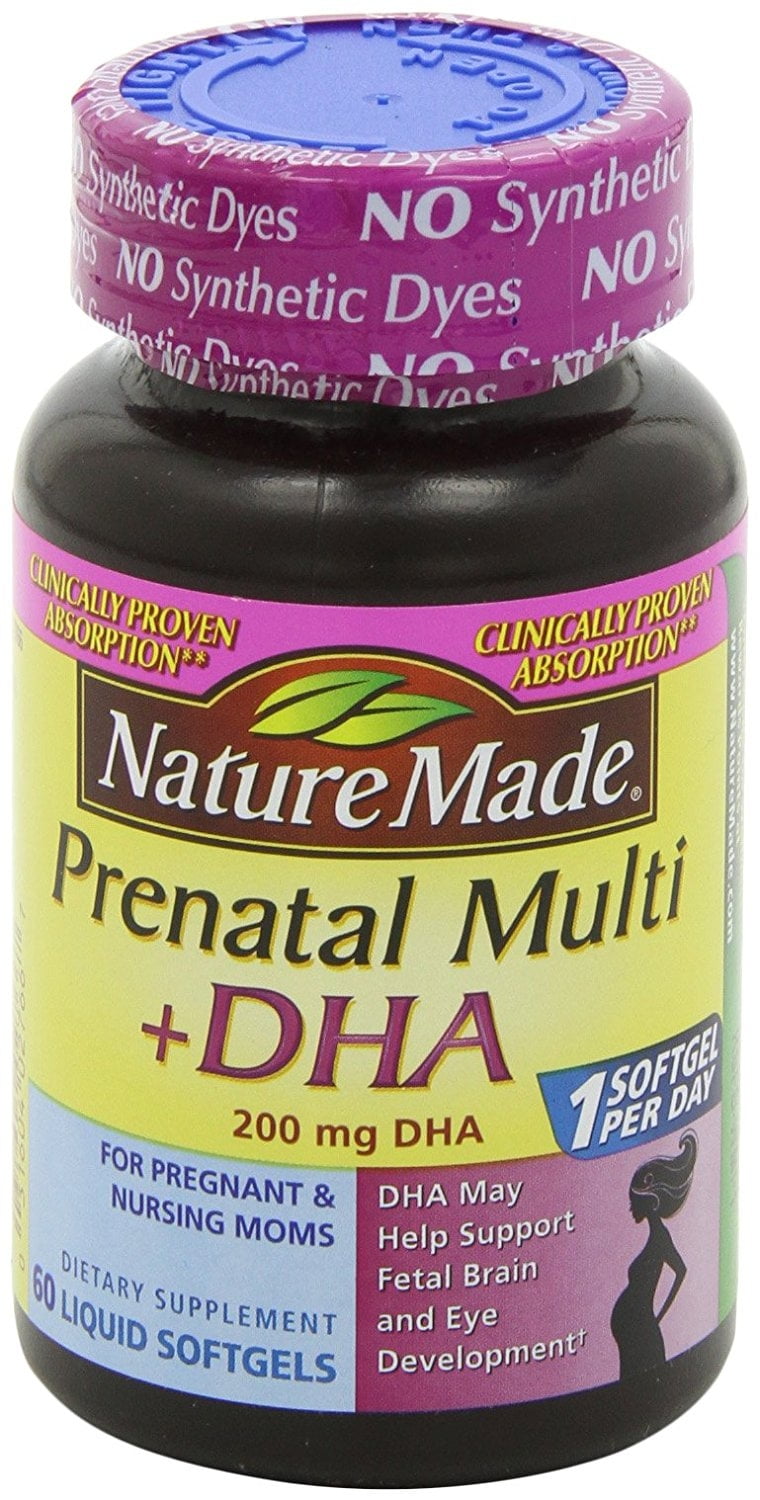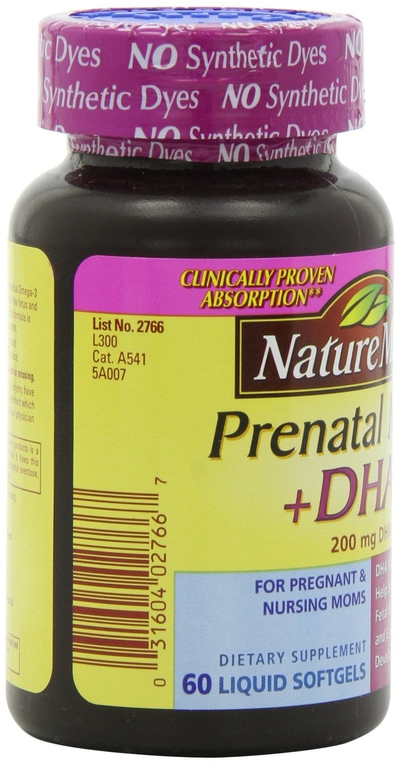 Nature Made Prenatal Multi + DHA combines the key nutrients of a prenatal multivitamin with 200 mg of omega-3 fatty acid DHA into one softgel.