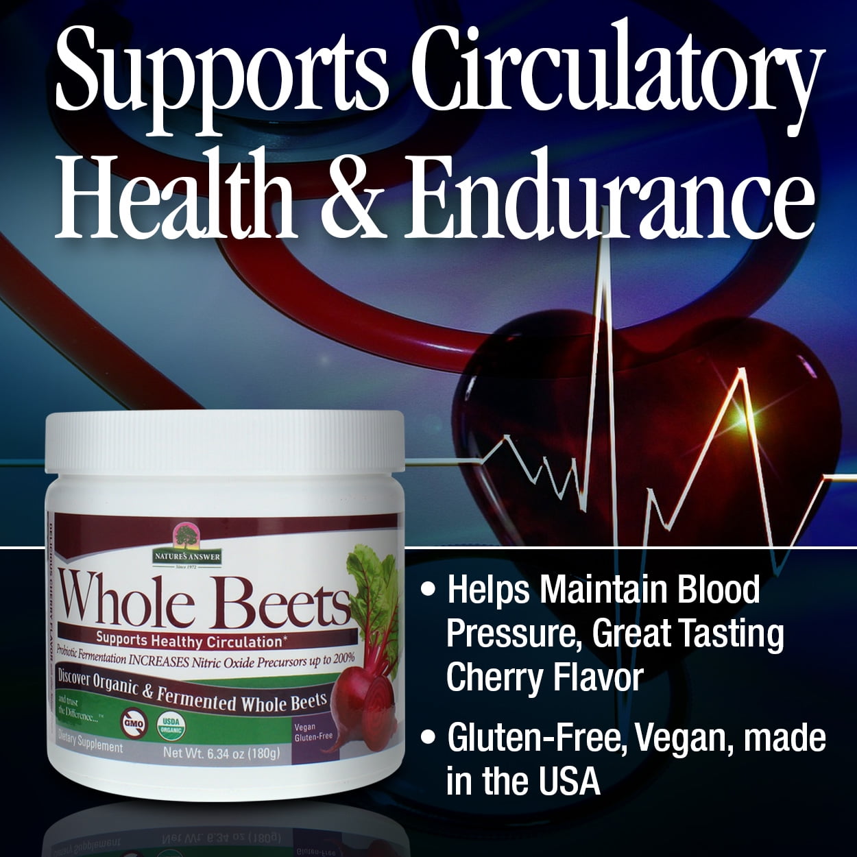 Nature’s Answer Whole Beet Root Powder, Organic & Fermented, 6.34oz. Whole Beets is an organic whole food powder not concentrate. Most importantly, our probiotic fermentation process yields up to 200% nitrate content over regular beet powder. These naturally occurring nitrates are then converted into nitric oxide (NO) in your body, which supports circulatory health & endurance and helps maintain healthy blood pressure levels*, and supports healthy immune function.* *These statements have not been evaluated by the Food and Drug Administration. This product is not intended to diagnose, treat, cure or prevent any disease.
