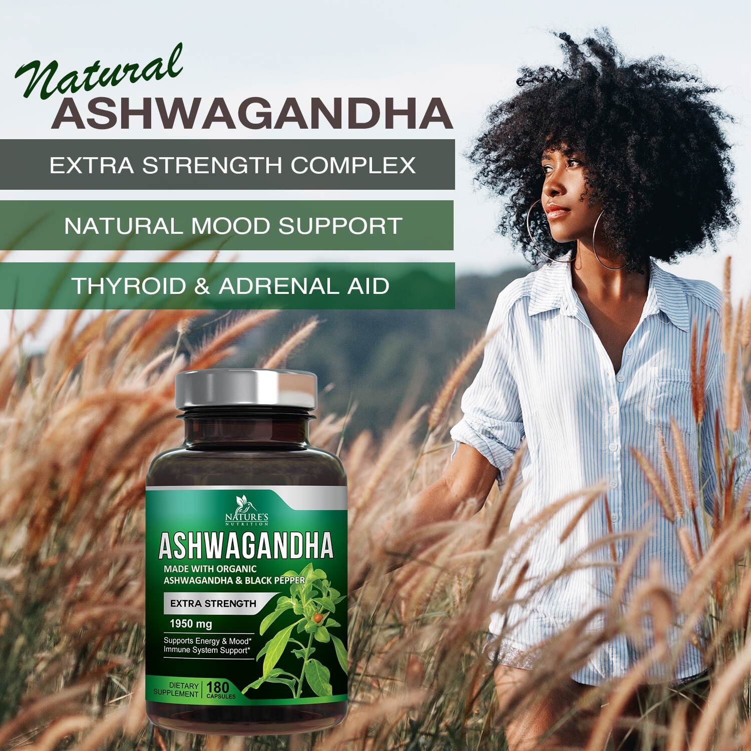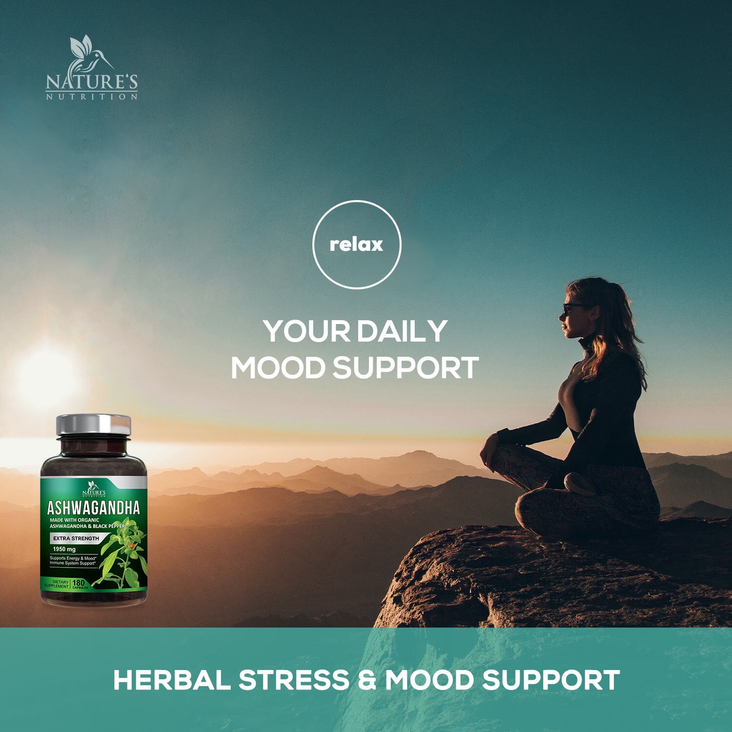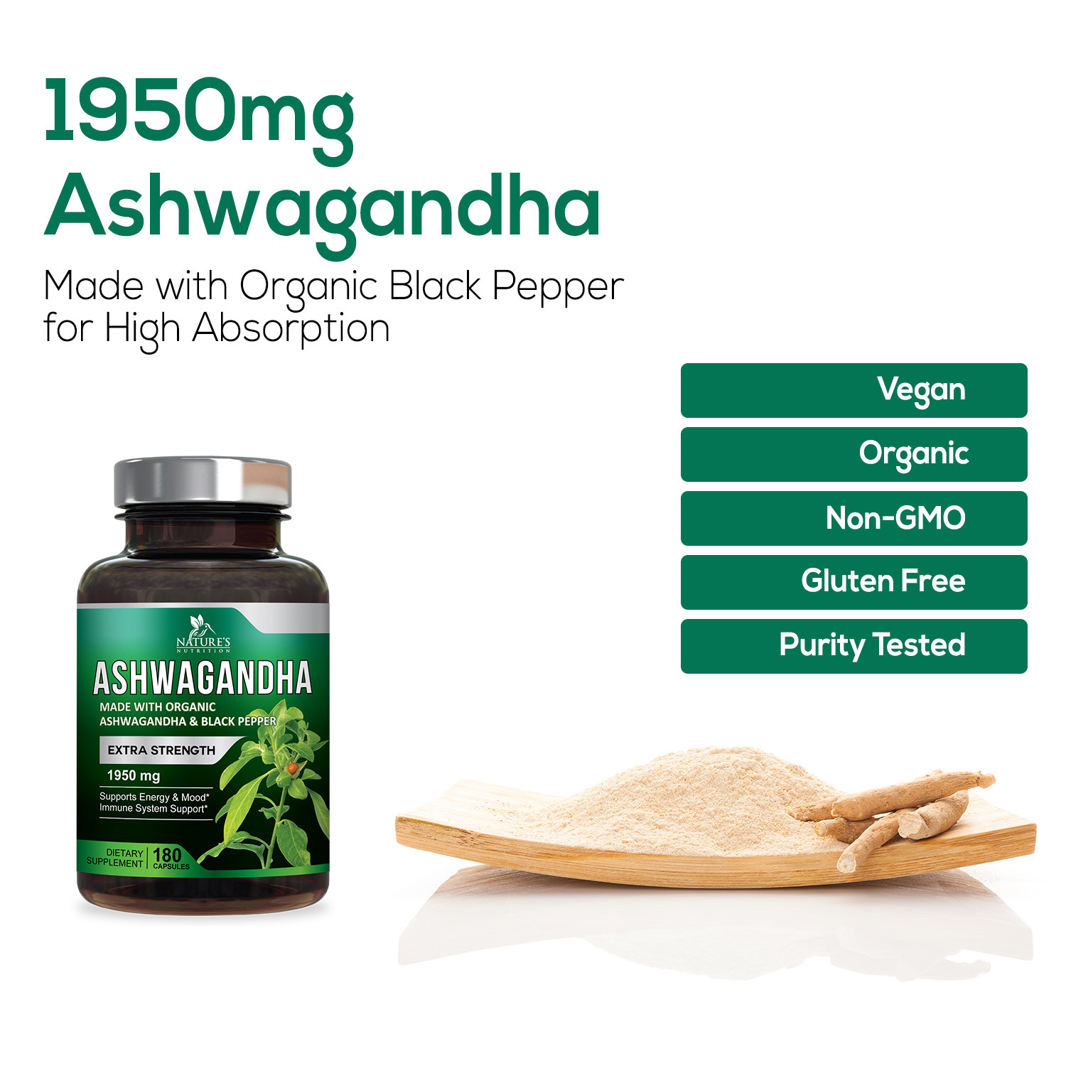 Organic Ashwagandha by Nature’s Nutritionwith Organic Black Pepper ExtractModern life can be stressful and overwhelming with the constant barrage of hectic lifestyles, work, 24 hour media, social feeds, traffic and more. We designed our Ashwagandha capsules to be a convenient way to help tune out the noise, and tune into your body. Each serving of our extra strength ashwagandha supplement is packed with 1300 milligrams of organic ashwagandha root powder and 10 milligrams organic black pepper extract for increased absorption. Delivering optimal support for a calm, positive mood and relaxation. Certified Organic Ashwagandha CapsulesExtra Strength 1300 milligramsNatural Well Being and Mood SupportVegetarian, Vegan FriendlyMade in the USA Did You Know: Ashwagandha, withania somnifera, is a powerful herb commonly used in Ayurvedic practices which support a calm, relaxed mood, and help the body’s natural response to temporary mental or physical stress. Organic Ashwagandha: Made with certified organic ashwagandha Black Pepper Extract: We added 10 milligrams black pepper extract to our formula to support bioavailability and efficient absorption No Additives: We do not include fillers or other artificial ingredients, just organic ashwagandha and black pepper Why Nature’s Nutrition:Premium Ingredients: We source the highest quality ingredients available and follow strict cGMP manufacturing guidelines.Expertly Formulated: Each ingredient has been hand picked according to quality standards that set us apart from other brands.Lab Tested: Made in the USA and third party lab tested to ensure each batch meets our premium standards.