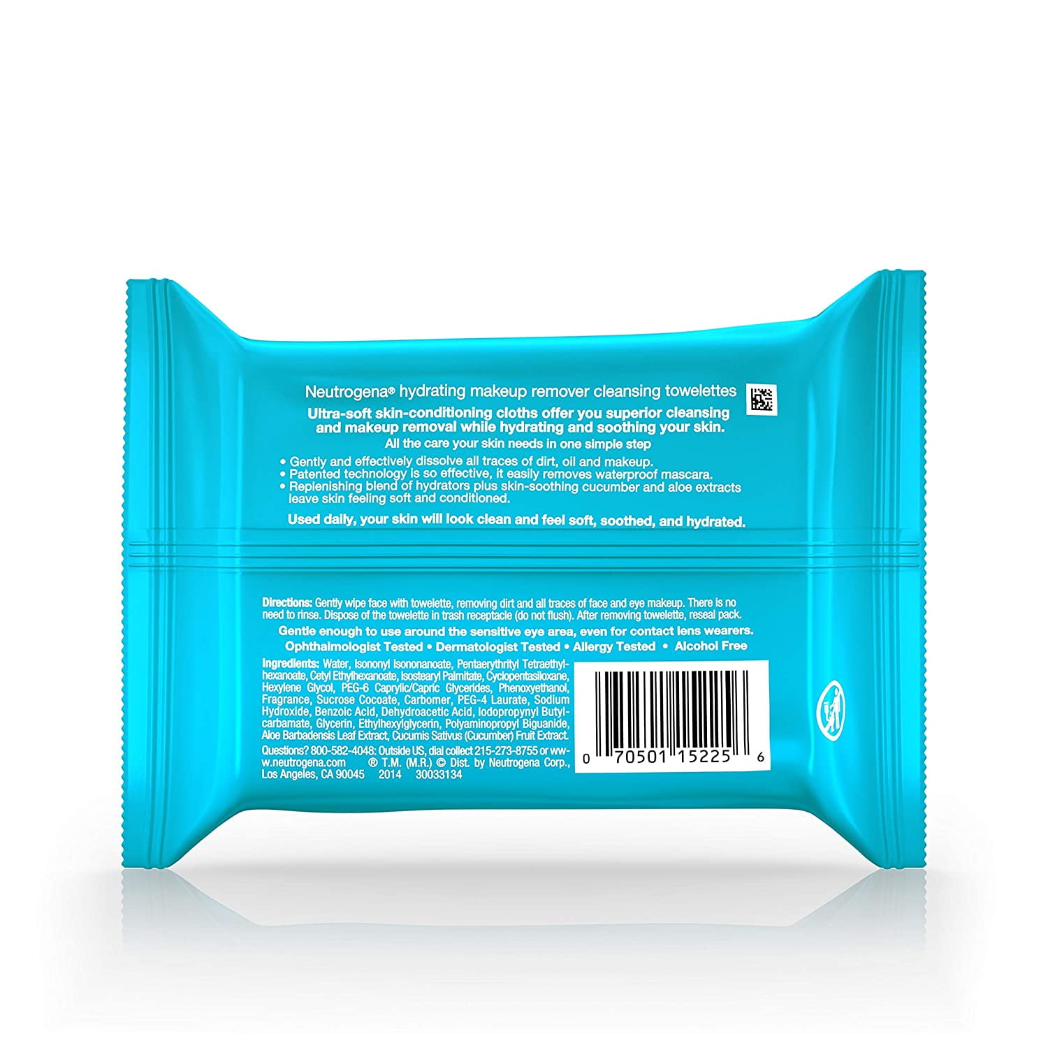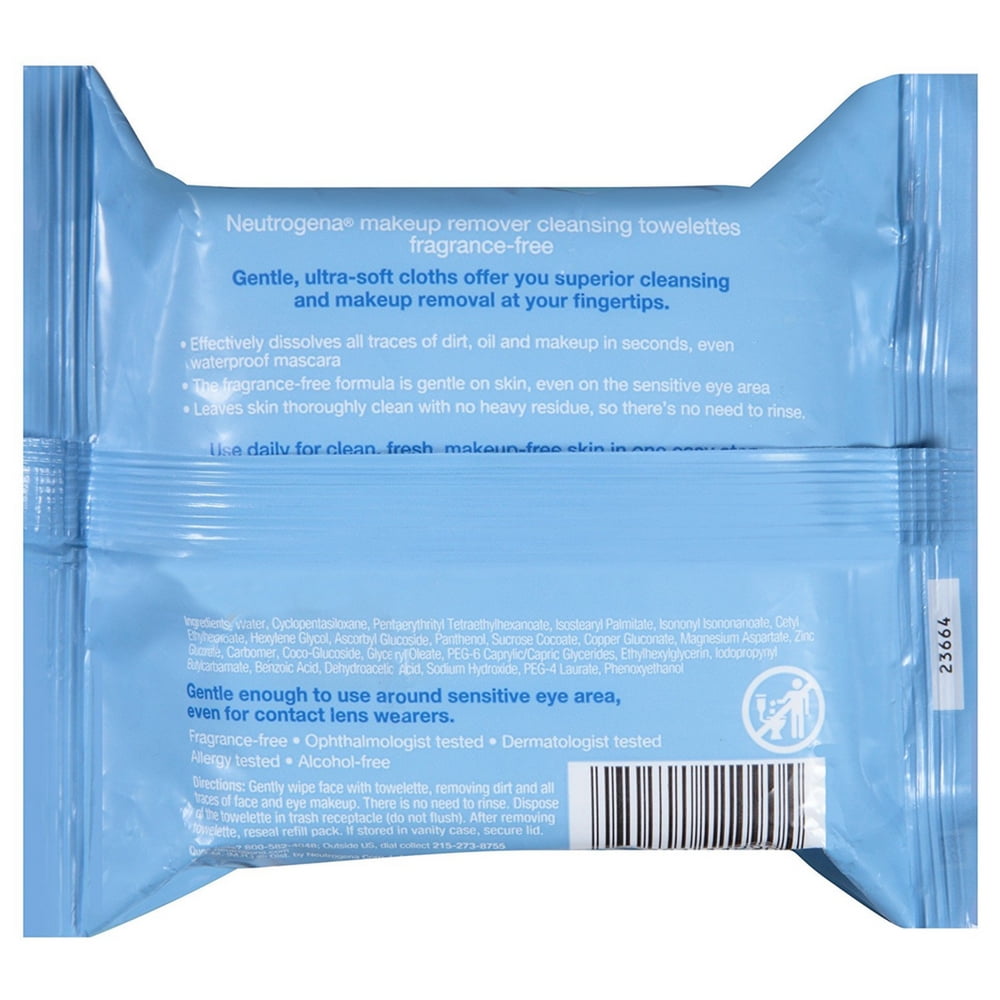 Ingredients:Water, Cyclopentasiloxane, Pentaerythrityl Tetraethylhexanoate, Isostearyl Palmitate, Isononyl Isononanoate, Cetyl Ethylhexanoate, Hexylene Glycol, Ascorbyl Glucoside, Panthenol, Sucrose, Cocoate, Copper Gluconate, Magnesium Aspartate, Zinc Gluconate, Carbomer, Coco-Glucoside, Glyceryl Oleate, PEG-6 Caprylic/Capric Glycerides, Ethylhexylglycerin, Iodopropynyl Butylcarbamate, Benzoic Acid, Dehydroacetic Acid, Sodium Hydroxide, PEG-4 Laurate, Phenoxyethanol.Neutrogena Make-Up Remover Cleansing Towelette, Fragrance-Free 25 ea (Pack of 3)