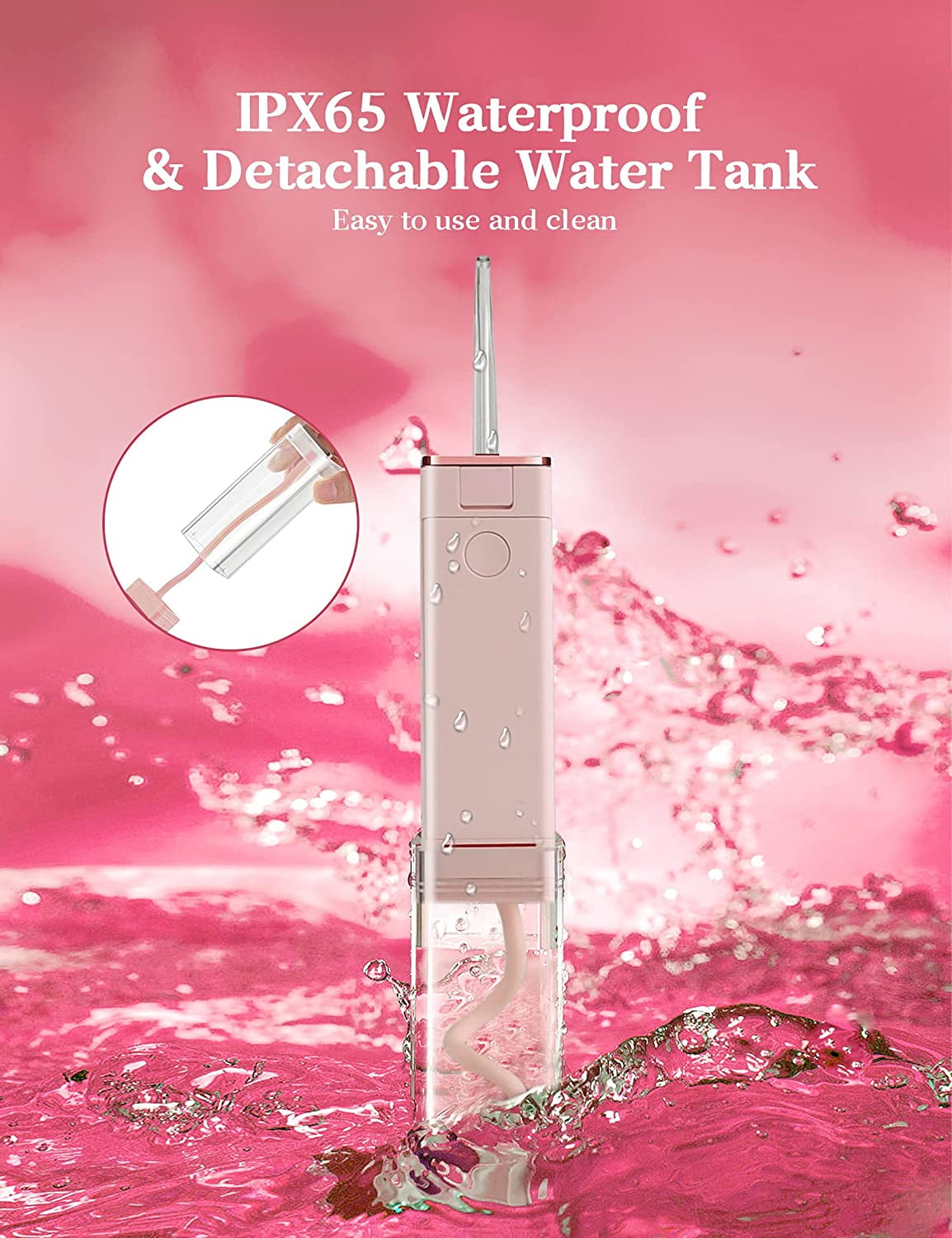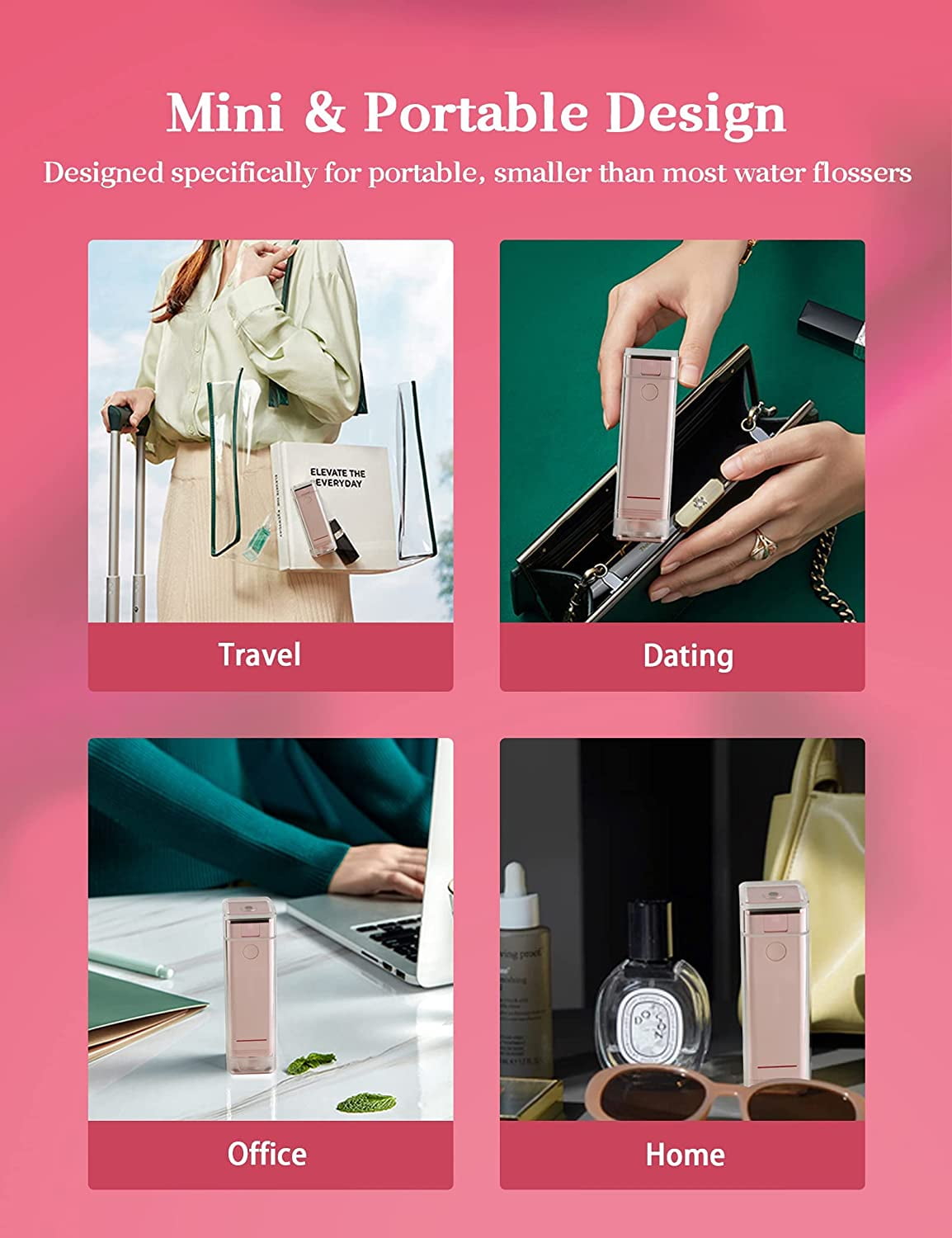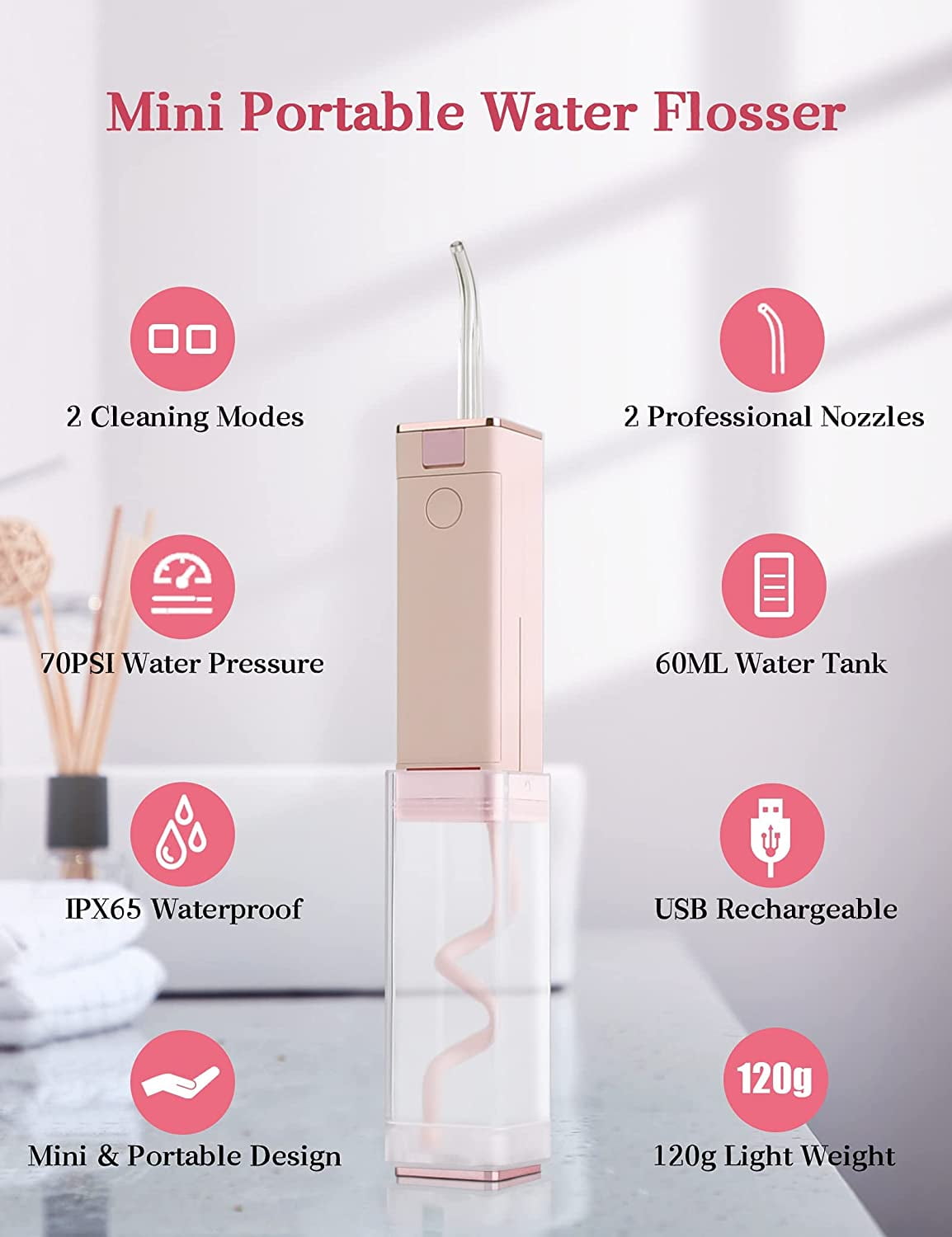 NEWDERMO Water Flosser – Professional Mini Pocket Cordless Dental Oral Irrigator with 60ML Water Tank, USB Rechargeable, IPX65 Waterproof, 2 Modes, for Dating / Business (Pink)