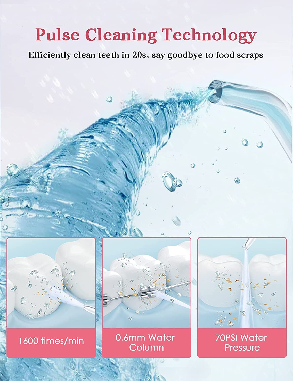 - Deeply Clean Teeth & Improve Gum Health】The water flosser remove 99.99% food residues, massage the gum effectively and promoting blood circulation. It is helpful for bleeding gums, bad breath, tooth decay, and sensitive teeth. 2 modes- normal mode and pulse mode. The normal mode can simply clean up food residues and is suitable for sensitive teeth. The pulse mode is designed with 1600 times/min,70PSI strong water pressure,0.06mm Water column. It can clean teeth deeply within 20s.
