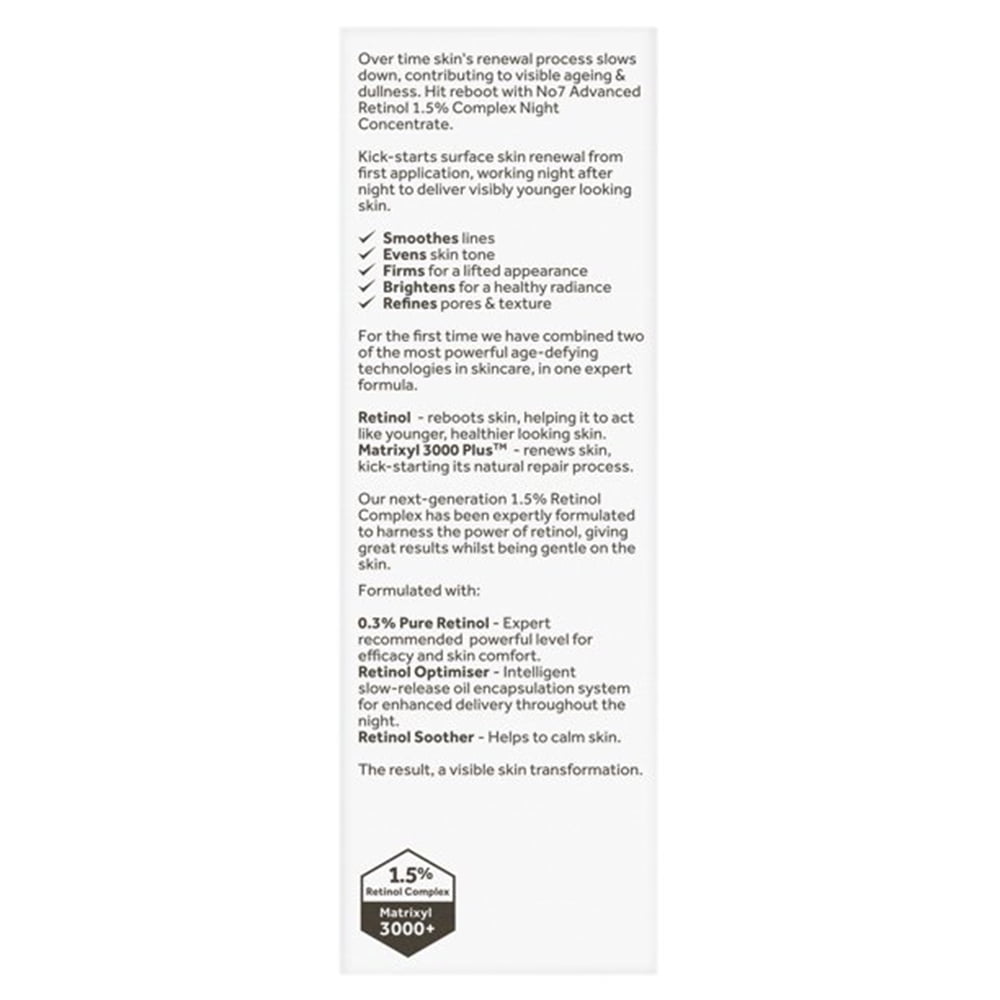 Smooths lines Evens skin tone Firms for a lifted appearance Brightens for a healthy look Refines pores & texture No7 Advanced Retinol 1.5% Complex Night Concentrate 1 fl oz is a new night concentrate created with a combination of two of the most powerful age-defying technologies in skincare in one expert formula. This supercharged concentrate actively targets the visible sign of aging and dullness to kick start surface skin renewal from the very first application, working night after night to deliver visibly younger-looking skin. 1.5% Retinol complex has been expertly formulated to harness the power of retinol, giving great results whilst being gentle on the skin. 0.3% Pure Retinol – the expert-recommended powerful level for efficacy and skin comfort reboots the skin helping it to act like younger, healthier-looking skin Matrixyl 3000 Plus – No7’s powerful anti-wrinkle peptide technology for helping to restore a more youthful appearance to your skin Retinol optimizer – an intelligent slow-release oil encapsulation system for enhanced delivery throughout the night Retinol Soother – helps to calm the skin.