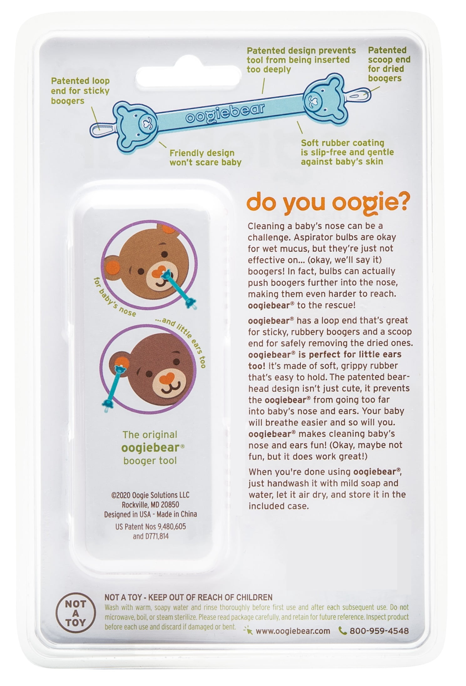 - BEAR-ABLE SAFETY AND COMFORT – oogiebear’s special rubber scoop and loop tips are gentle enough for sensitive little noses and ears and firm enough to clean quickly and effectively, while the patented bear head design ensures it never goes up too far.