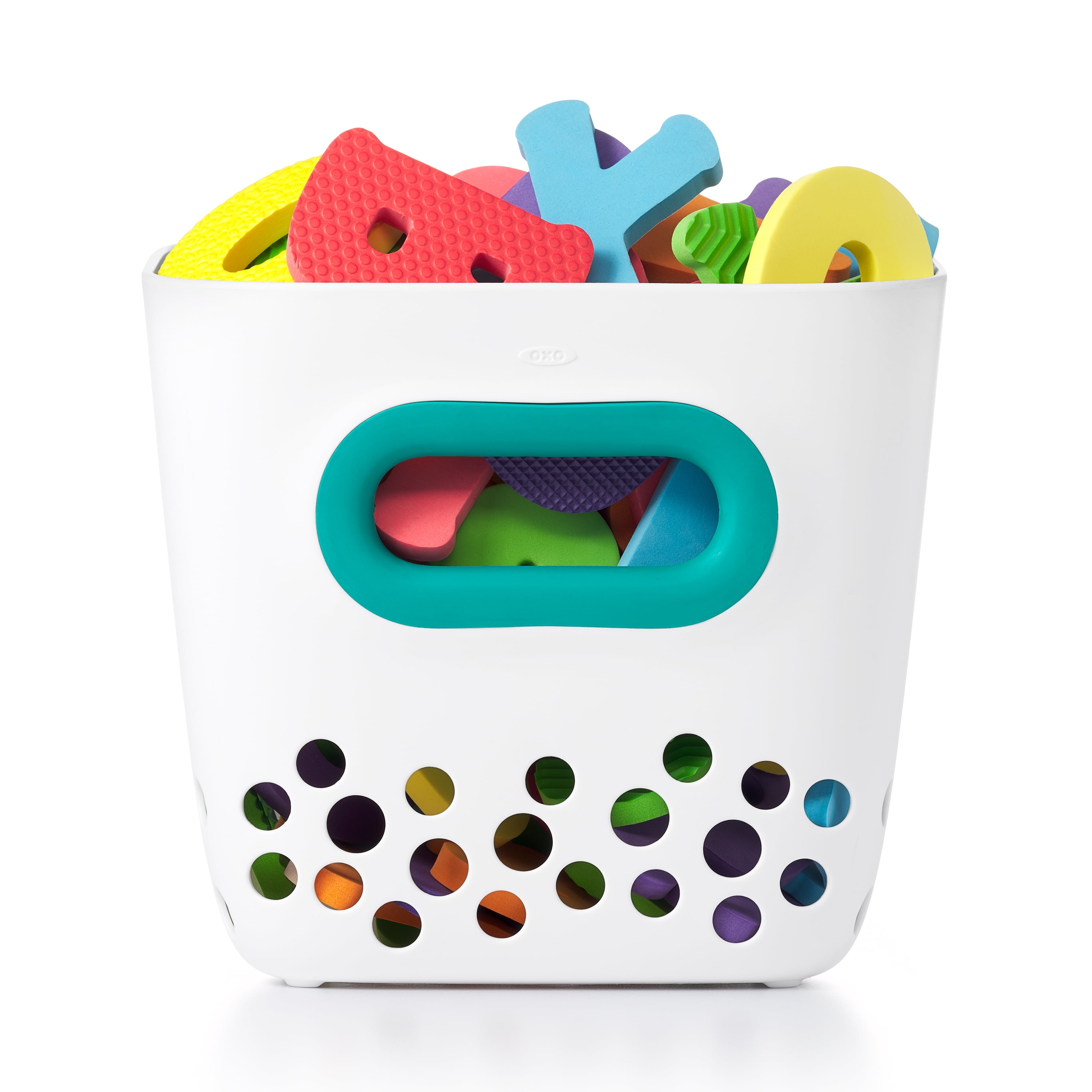 Give your tot’s bath time toys a compact, organized, and convenient home in the OXO Tot Bath Toy Bin. This slim Bin features a large, soft, comfortable handle to easily scoop toys out of the tub. Place the Bin on the sturdy adhesive tape plate to store, or use its flat bottom to stand it up next to the bathtub. Large holes let air get through and water drain so toys and accessories dry quickly. The sleek, compact design is perfect for any bathroom decor and is great for smaller or shared bathrooms. Don’t let the name fool you – the Bath Toy Bin is also great for storing shampoo and body wash bottles too. The Bin is dishwasher safe for easy cleaning.