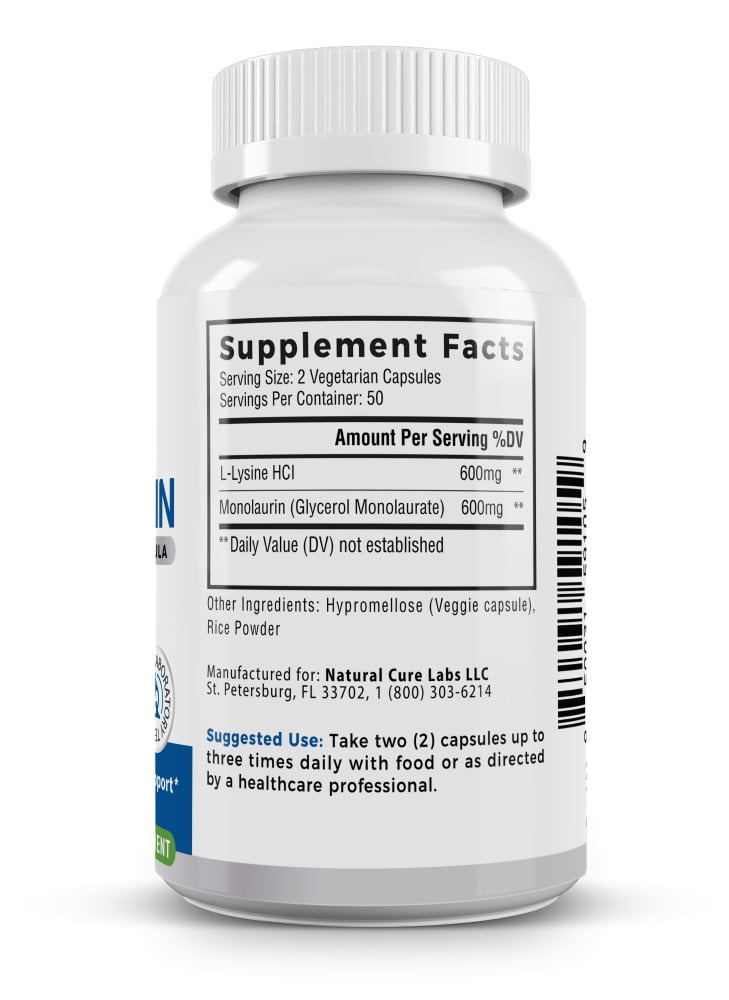 1:1 Ratio: 600mg of L-Lysine + 600mg of Monolaurin per serving