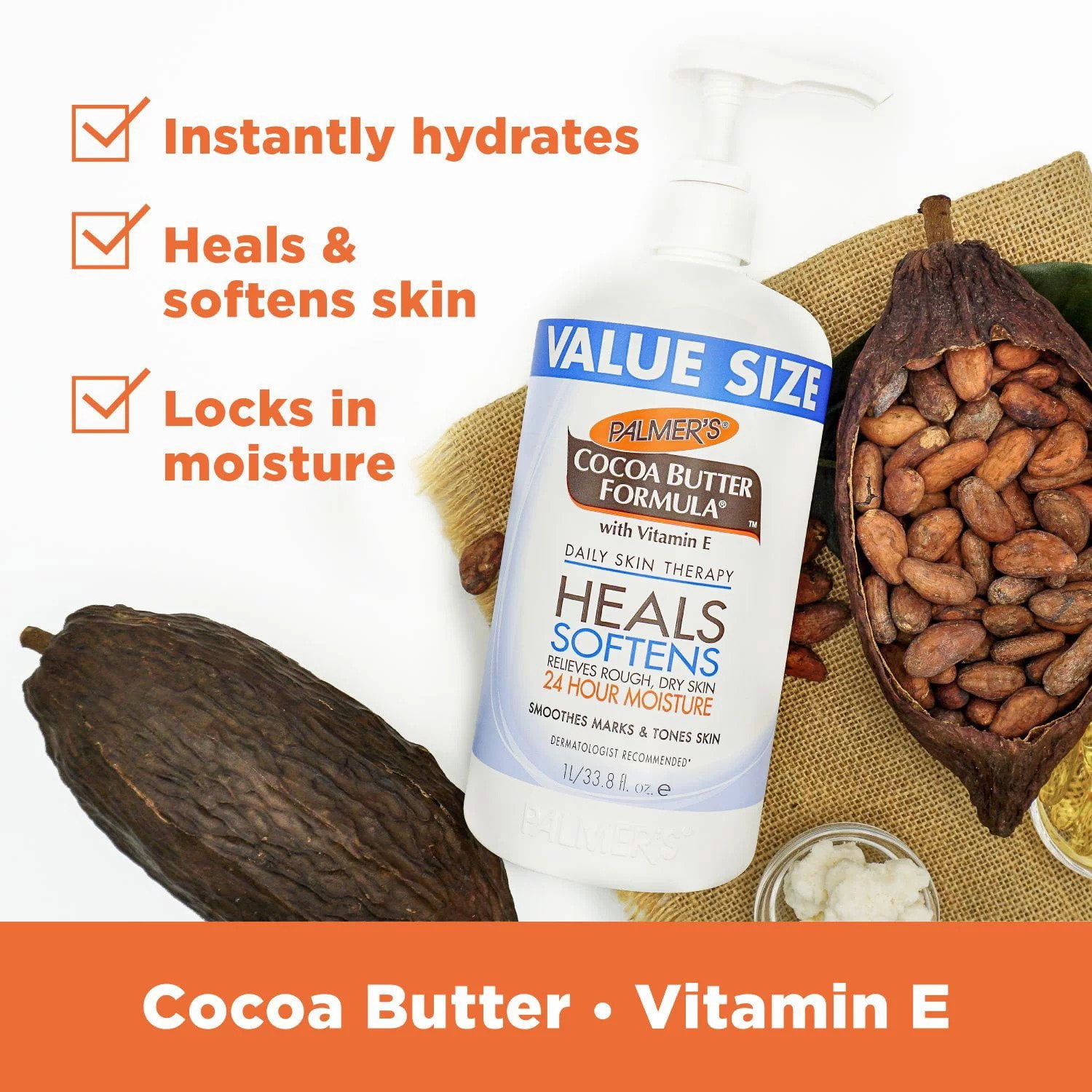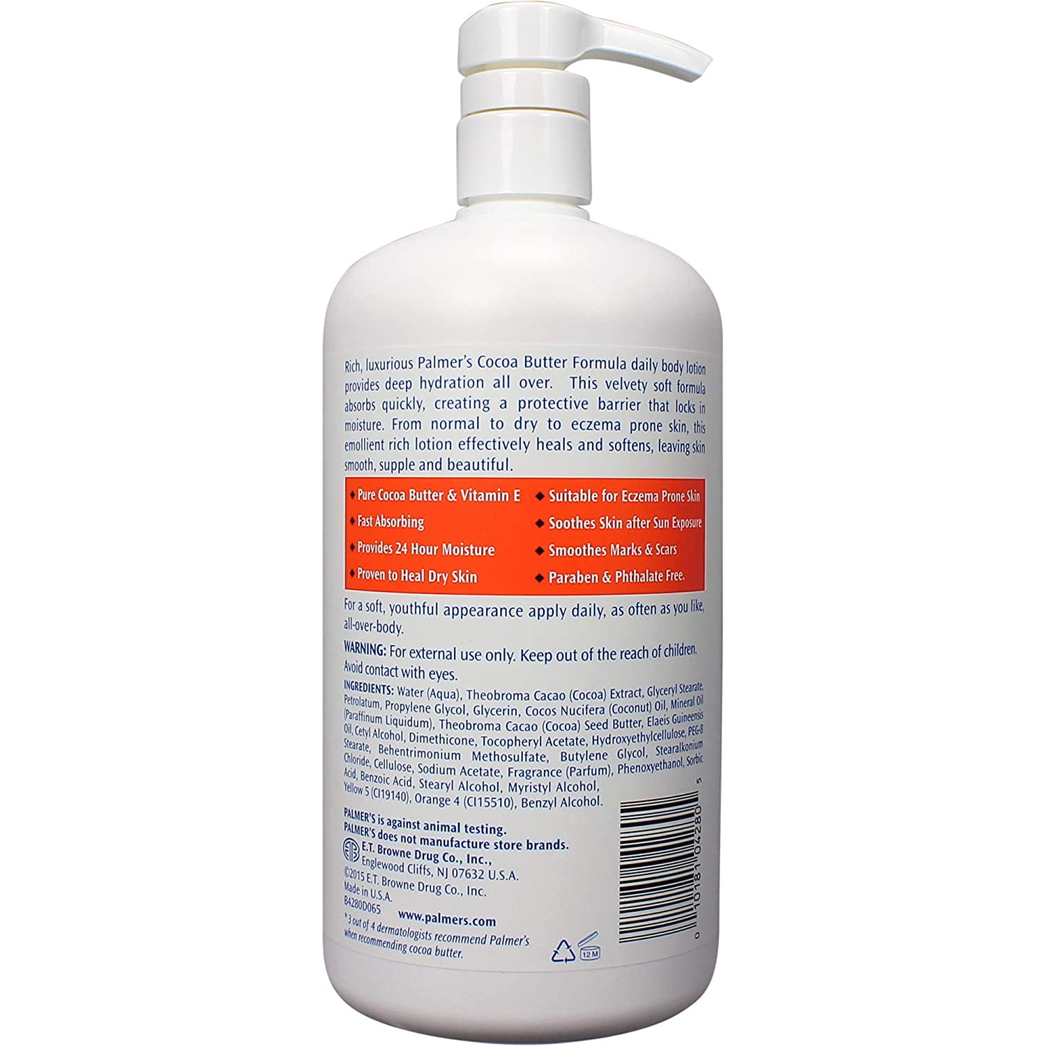 • The Palmers Cocoa Butter Formula with Vitamin E Daily Skin Therapy Lotion 33.8 fl. oz. 2pk.&M2&Specifications Pure cocoa butter and vitamin E Fast absorbing lotion Provides 24-hour moisture Proven to heal dry skin Suitable for eczema prone skin No parabens phthalates mineral oil gluten sulfates or dyes Product Disclaimer Product pages contain information provided by thirdparty sellers and other content providers. • Despite our best efforts to make sure that information is accurate we do not guarantee it and images descriptions specifications or other attributes may be incomplete out of date unreliable or miscategorized. • Before you buy use or consume a product you should always review nutritional ingredient and allergen information and any warnings or instructions. • We do not guarantee the accuracy of nutritional labels or any other information on product packaging.The Palmers Cocoa Butter Formula with Vitamin E Daily Skin Therapy Lotion 33.8 fl. oz. 2pk.&M2&Specifications Pure cocoa butter and vitamin E Fast absorbing lotion Provides 24-hour moisture Proven to heal dry skin Suitable for eczema prone skin No parabens phthalates mineral oil gluten sulfates or dyes Product Disclaimer Product pages contain information provided by thirdparty sellers and other content providers.Despite our best efforts to make sure that information is accurate we do not guarantee it and images descriptions specifications or other attributes may be incomplete out of date unreliable or miscategorized.Before you buy use or consume a product you should always review nutritional ingredient and allergen information and any warnings or instructions.We do not guarantee the accuracy of nutritional labels or any other information on product packaging.