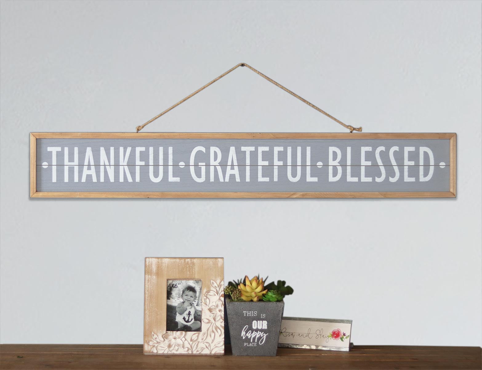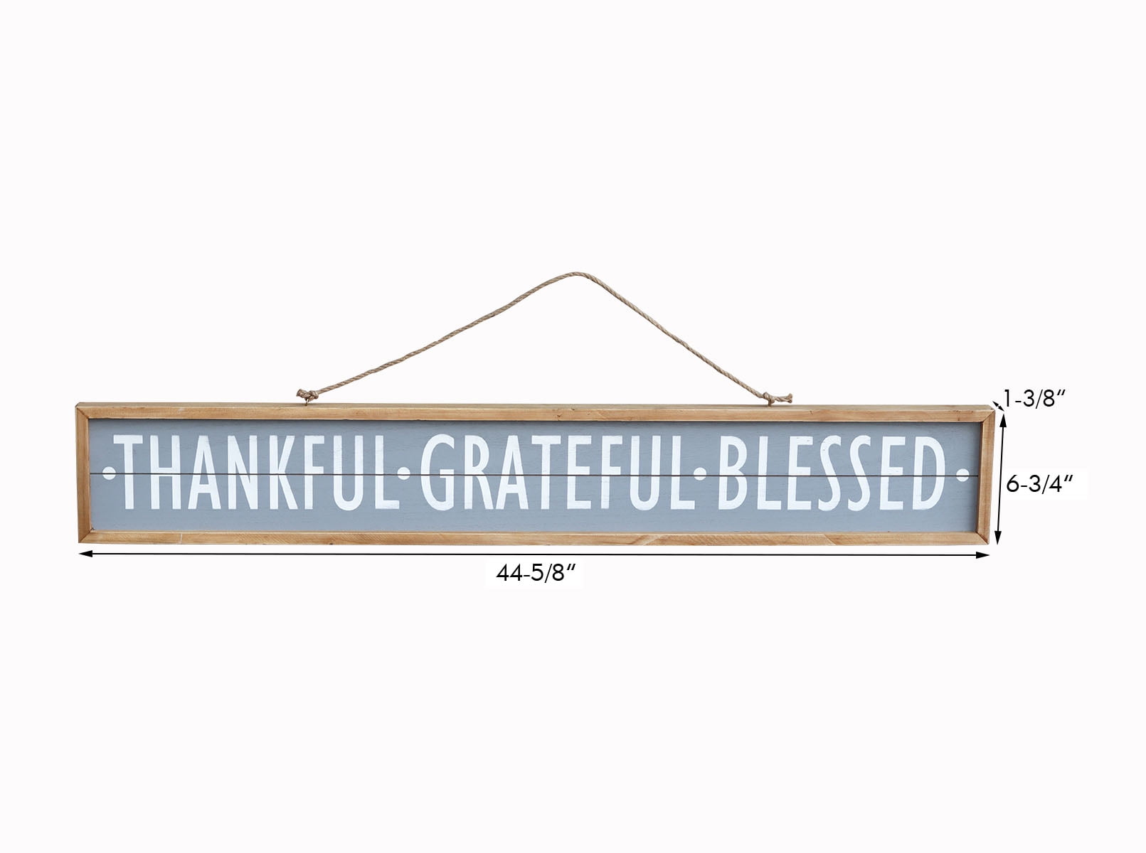 This double-sided wooden framed wall sign features white inspirational sentiments on the gray background. One side with the message "THANKFUL GRATEFUL BLESSED", the other side with the message "HOME SWEET HOME". Comes ready to hang with a jute rope. Hang this decorative wall plaque to any wall in your home as a warm daily reminder. It is a wonderful addition to the kitchen wall, living room, hallway, covered porch, balcony, garage. Send as a thoughtful gift for a friend, loved one or keep for yourself and decorate your home. Let the words on this plaque be a warm embrace each day.Size measures 44-5/8"L x 1-3/8"D x 6-3/4"H. Made of solid wood, MDF and jute. This decorative wood framed wall sign features a cute family inspirational and uplifting quote on double sides for fun. Great as a warm daily reminder. Sign with powerful messages: Thankful Greatful Blessed / Home Sweet Home. The designs are printed directly on the wood for a more realistic effect. With a jute rope on top, adding a vintage feel to this decorative sign. This elegant piece of board is designed to bring a happy, sweet touch to any home. It will look great hanging on your porch, kitchen, living room or bedroom. Definitely a lovely housewarming gift or a Thanksgiving gift!
