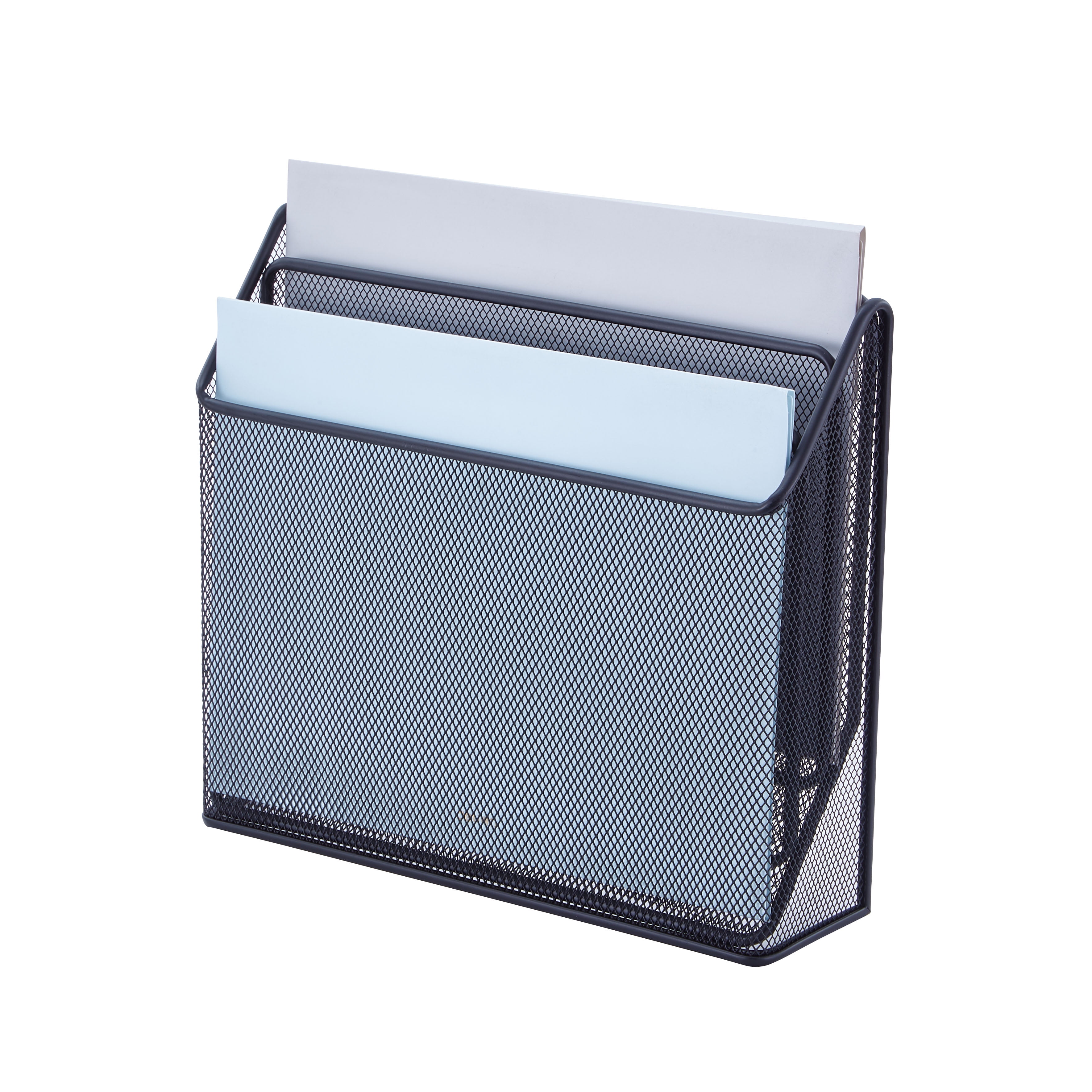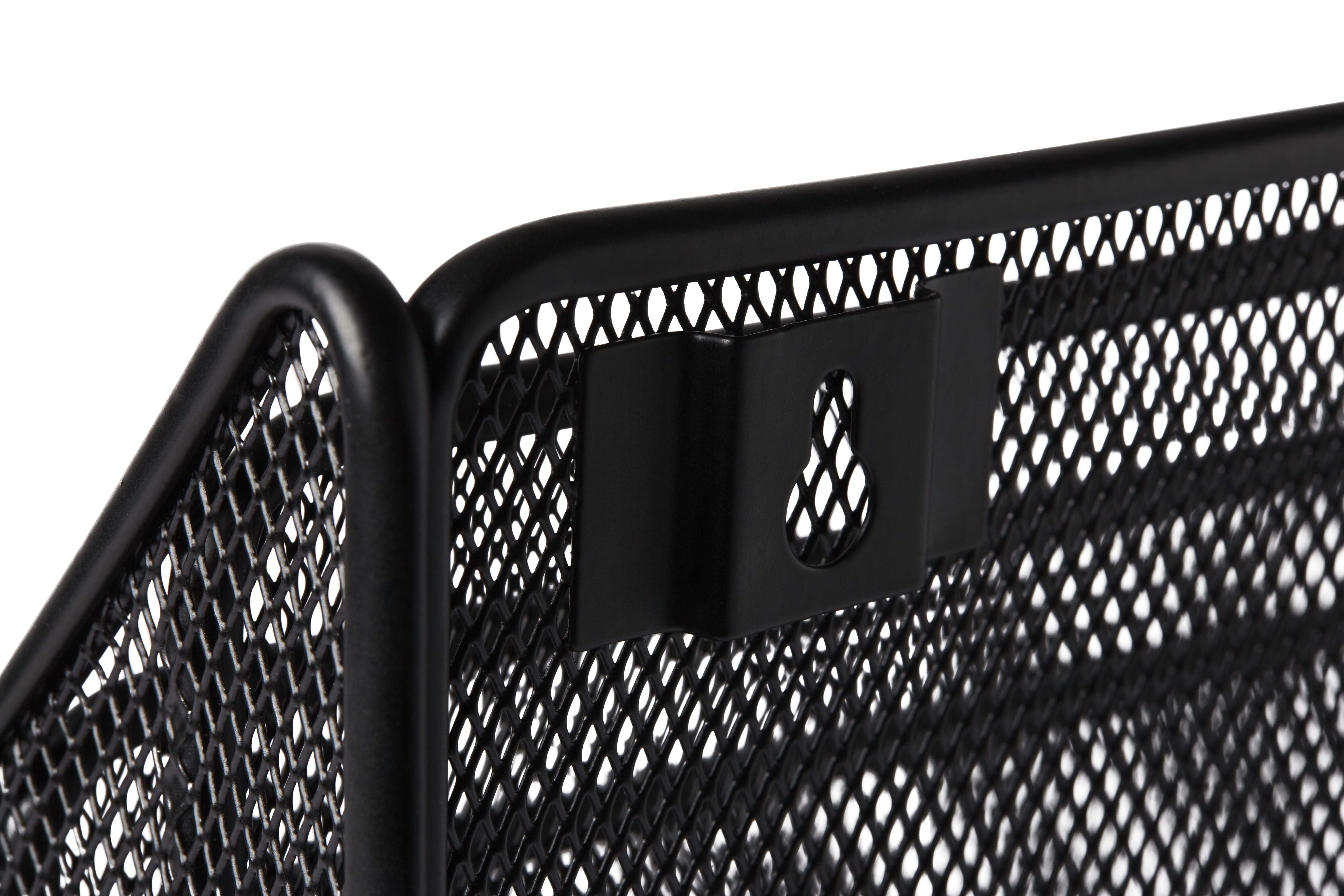 Keep your desk clean and organized with the Pen + Gear Metal Mesh Desk Organizer with Hook, 3 Tiers, Black. This space-saving desk organizer holds folders, files, documents, notepads, and more thanks to three separate compartments designed to keep all your paperwork within reach. With an open-top design, this file organizer is perfect for organizing all your loose paperwork, notes, and documents. Mount it on your wall to take full advantage of your desktop or set it on top of your desk or cabinet. The metal mesh construction and tiered panels allow you to organize your paperwork quickly from most to least important, while allowing you to view and identify your papers fast. The separate panels also separate and securely hold your items in place. Lightweight and durable, the Pen + Gear Metal Mesh Desk Organizer with Hook, 3 Tiers, Black is an office essential.