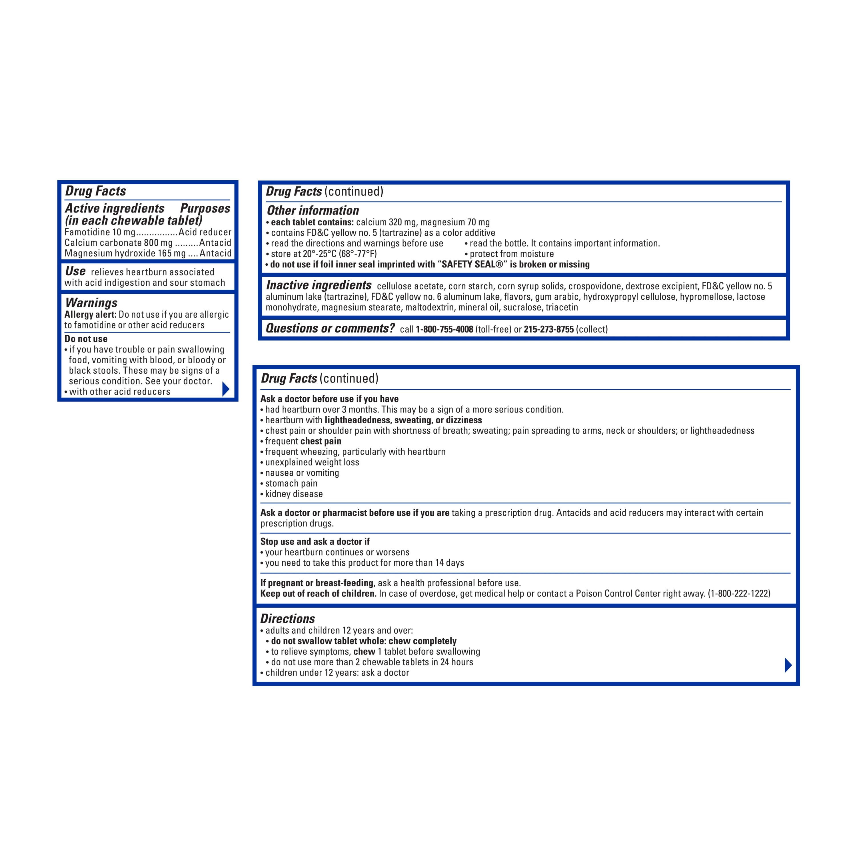 - Each chewable contains 10 milligrams of famotidine, a known ingredient that acts as an acid reducer