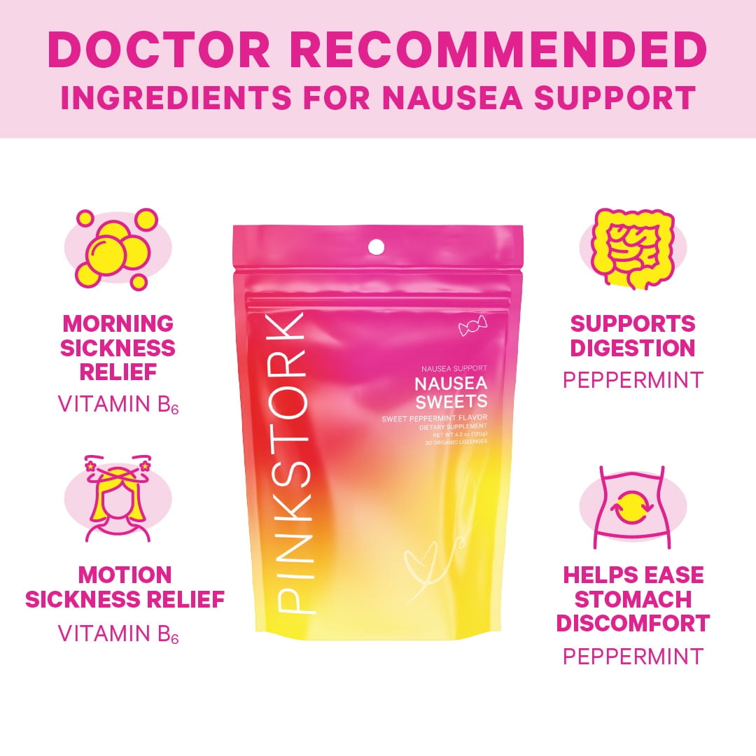 Pink Stork Nausea Relief Sweets support your relief from nausea, morning sickness, and digestive discomfort. Formulated with Organic Peppermint and Vitamin B6, this package contains 30 hard drops for adults to support relief from nausea, vomiting, migraines, morning sickness, indigestion, and bloating. Sweet, discreet, over-the-counter nausea relief for mild ailments- Nausea Sweets can also be used with any Pink Stork Morning Sickness or Nausea relief products! Pink Stork products are proudly made by women, and for women. Proudly made without Gluten, Dairy, Soy, Fish, Nuts, or GMOs. These statements have not been evaluated by the Food and Drug Administration. This product is not intended to diagnose, treat, cure, or prevent any disease Try it and love it, or send it back.