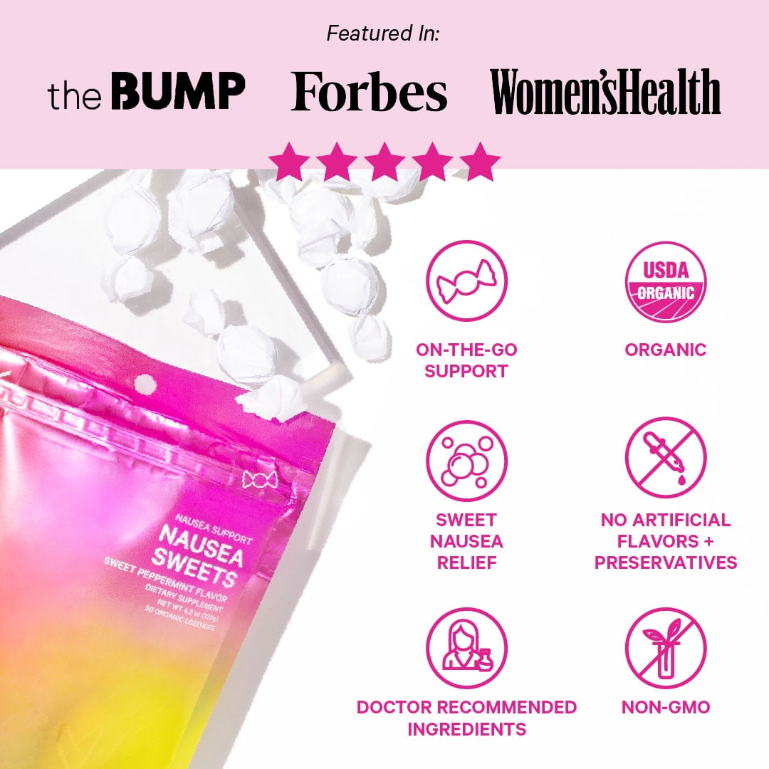 - Nausea relief: Provide relief from nausea, morning sickness, and motion sickness. 30 individually-wrapped sweets with natural peppermint flavor.