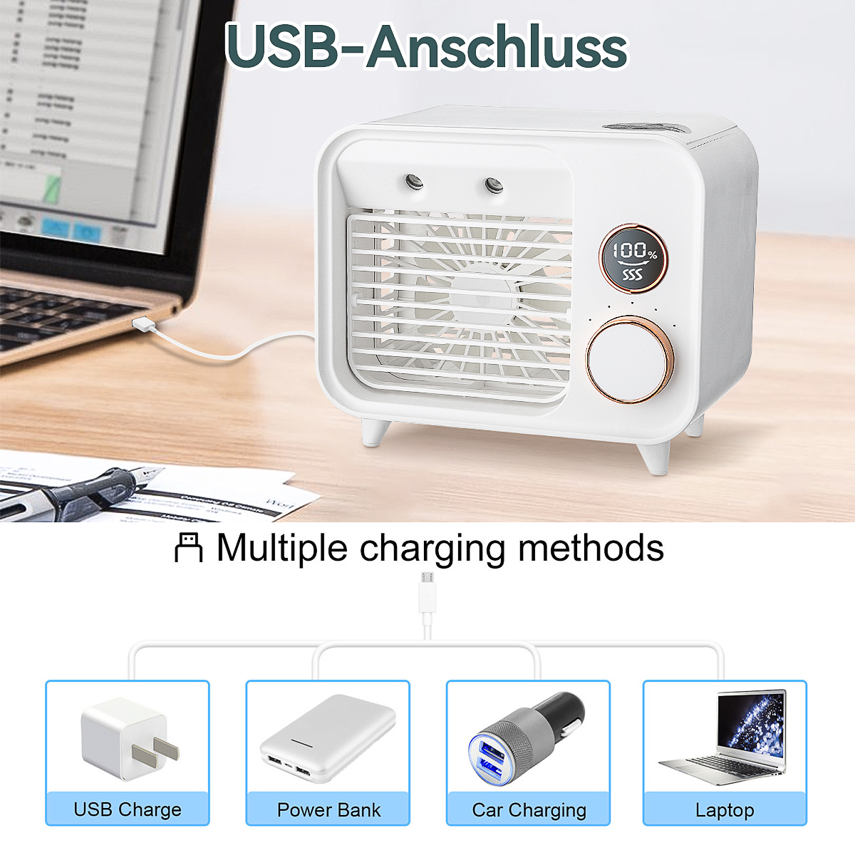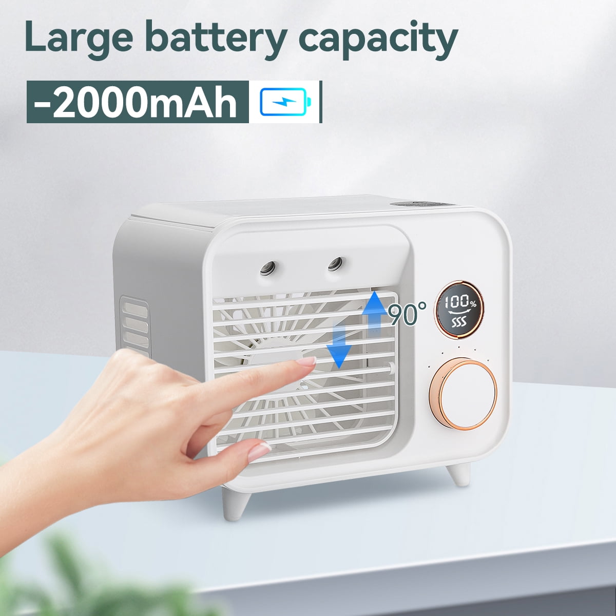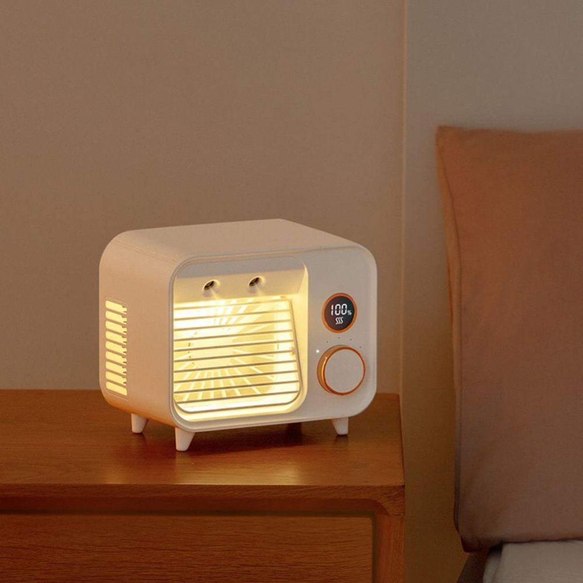 5 In 1 personal air conditioner fan, humidifier, air cooler, aroma diffuser, night light. You can use it as an ordinary small fan, add water or ice to make cooler cold wind.