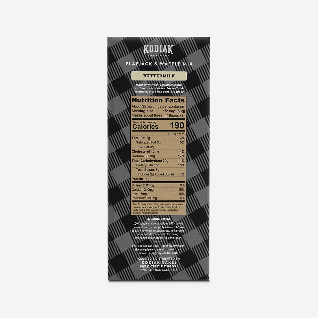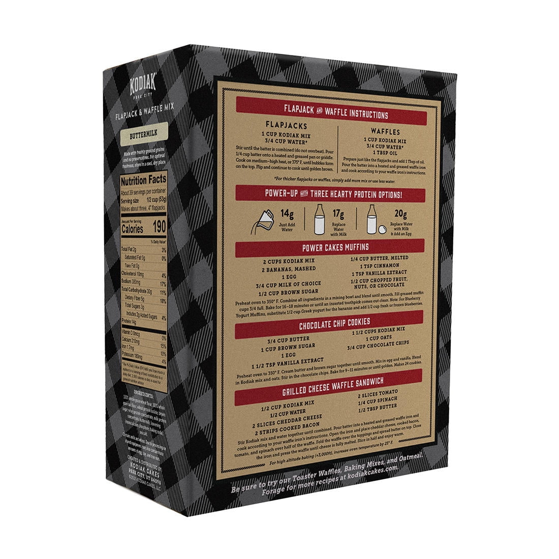 Product of Kodiak Power Cakes Buttermilk Flapjack & Waffle Mix, 3 pk./20 oz. Kodiak Power Cakes Buttermilk Mix helps make perfect breakfast while pleasing your taste buds and nourishes your health. Made from non-GMO ingredients, it contains no artificial preservatives. 100% whole grains. 14g protein per serving. Up to 18g of protein if you use milk and 21g if you add milk and eggs. Non-GMO ingredients. No artificial preservatives. Only 3g of sugar per serving. 5g fiber. Just add water or milk for a delicious meal in minutes. 32 servings per container Power Cakes buttermilk, Power Cakes pancake mix, Power Cakes honey, Power Cakes oatmeal