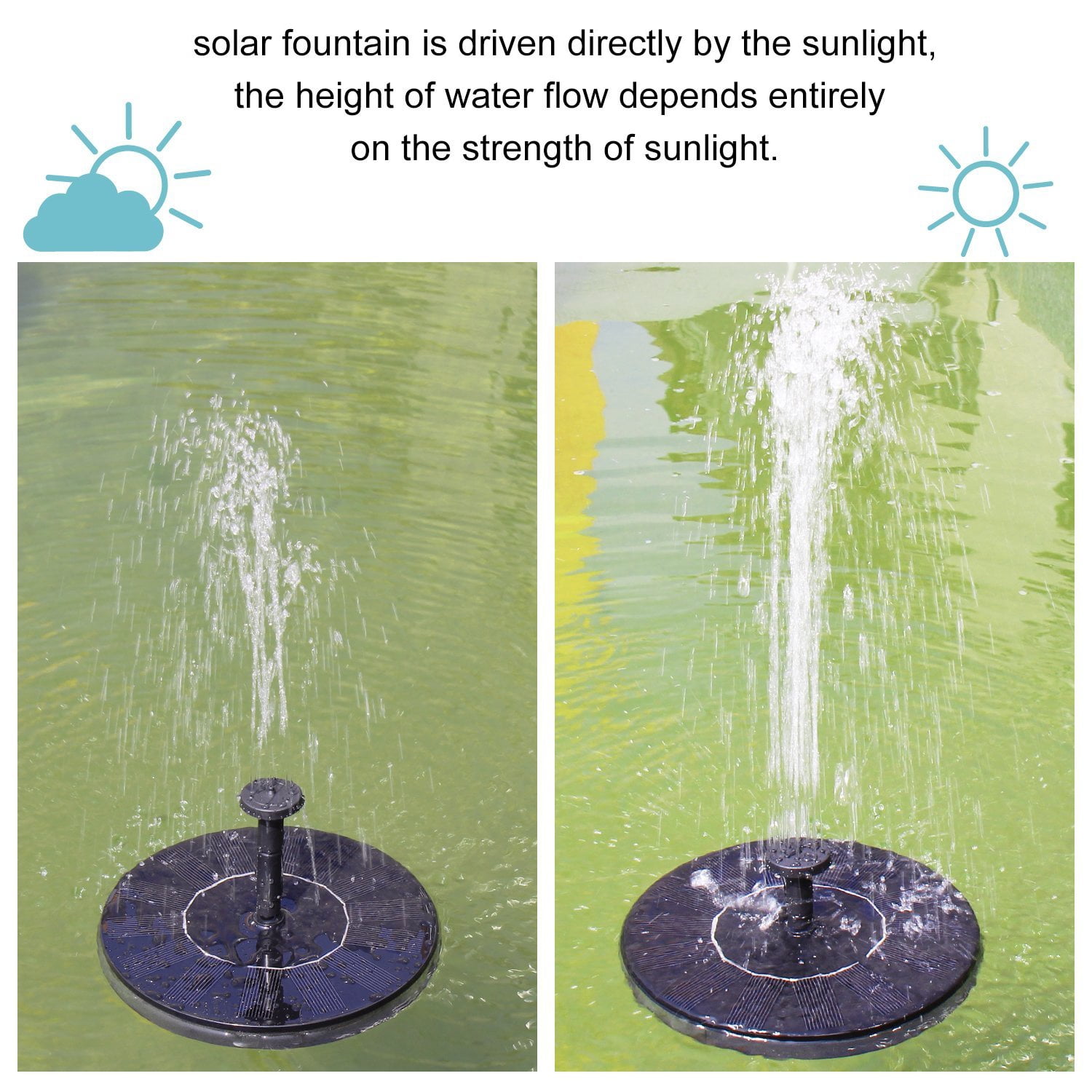 Eco-Friendly Solar Fountain Pump: Made up of highly efficient solar panel, solar powered completely, no battery or electricity needed, Eco-Friendly and saving energy. Note: No battery to store solar energy, the stronger sunlight the better work.