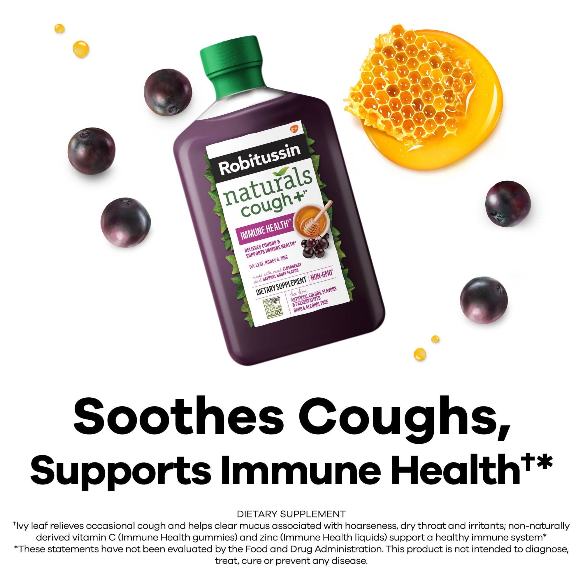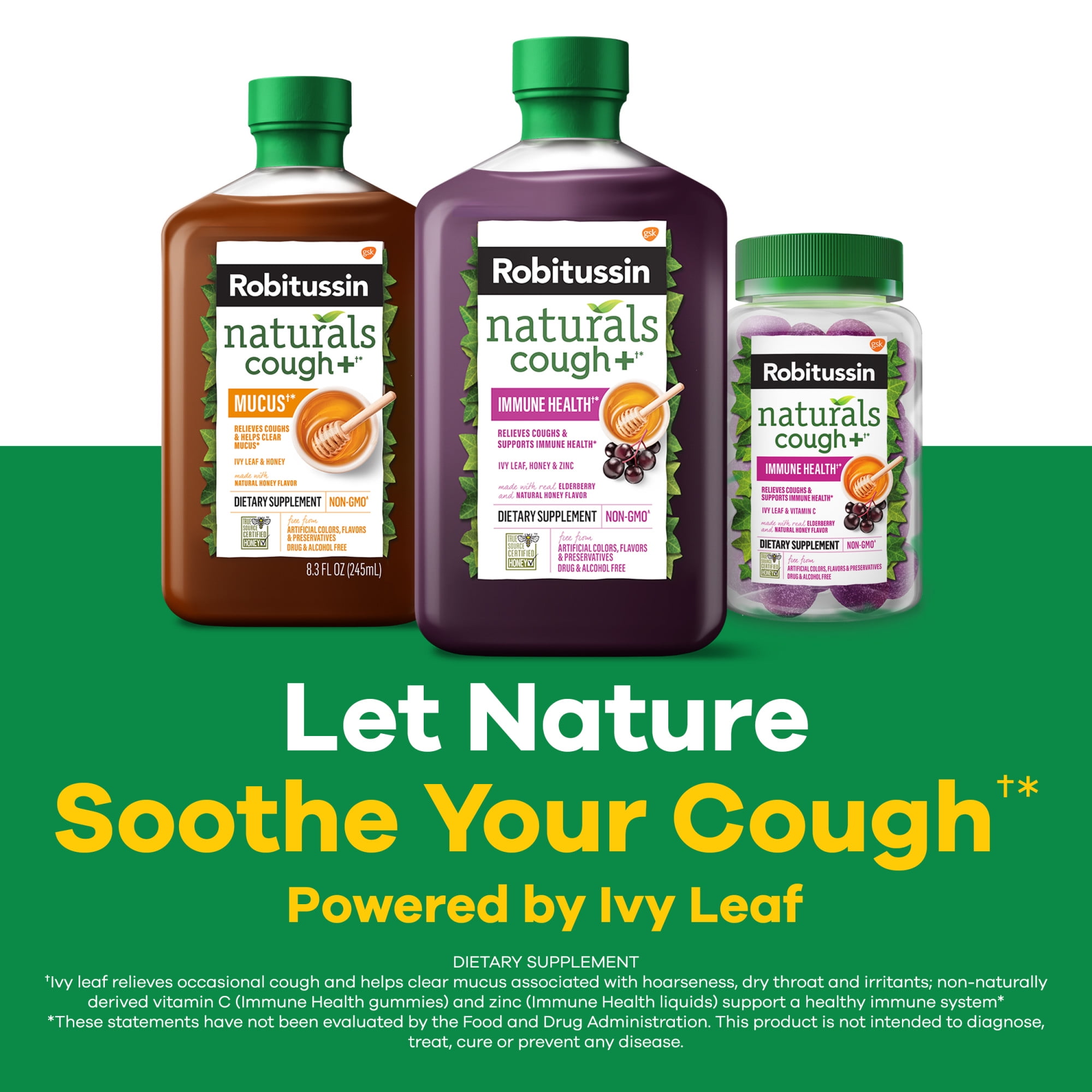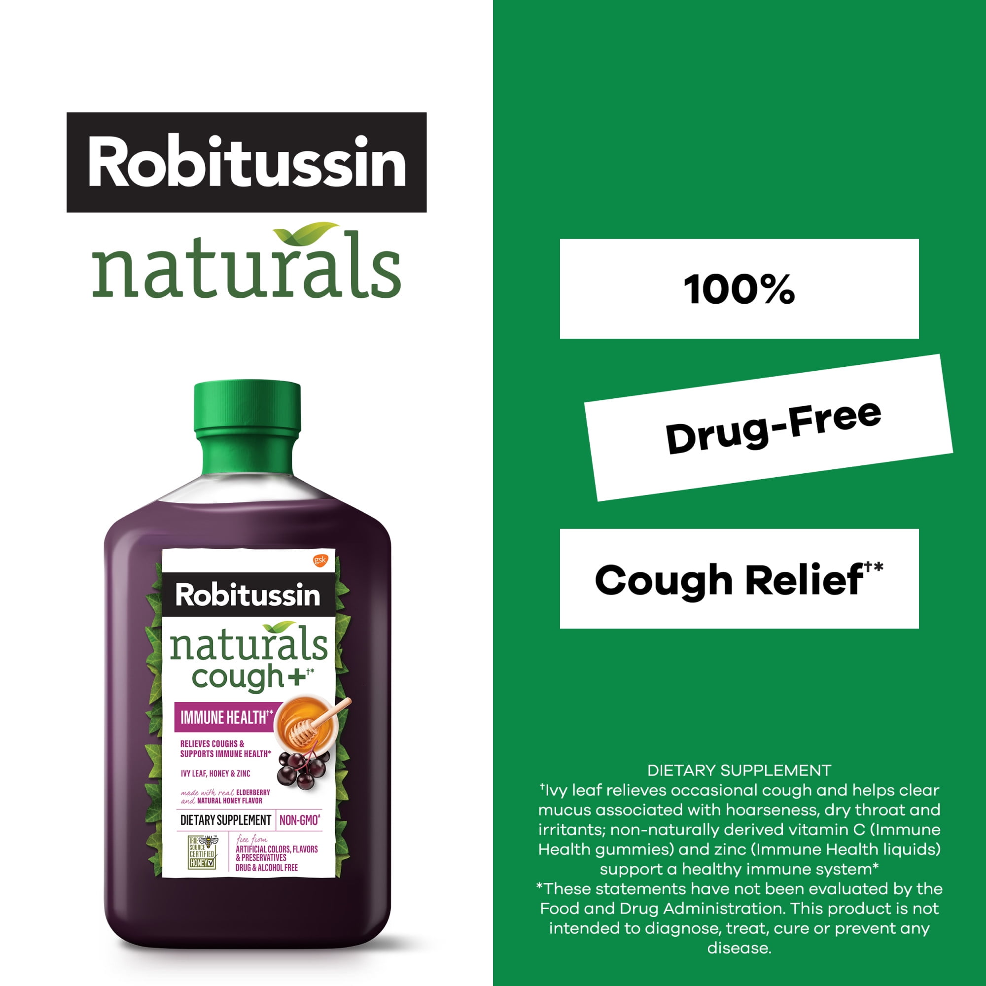 (1) Honey and ivy leaf relieve occasional cough associated with hoarseness, dry throat and irritants and ivy leaf helps clear mucus when coughing; zinc supports a healthy immune system (2) (2) These statements have not been evaluated by the Food and Drug Administration. These products are not intended to diagnose, treat, cure or prevent any disease. (3) For more information on our non-GMO standard, visit robitussin.com