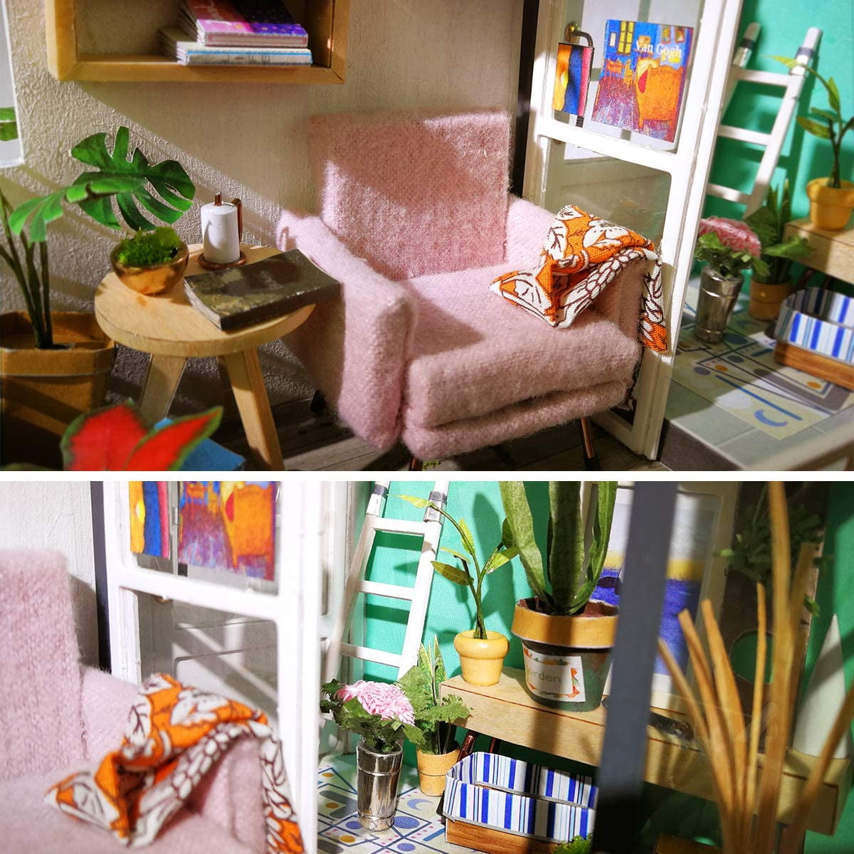 - 【DIY MODEL KITS】Wood,Fabric,Paper-cut,Glue,Pigment,Tweezers are included.The diy mini dollhouse is well made.The tiny accessories showed in the picture can be painted,cutted or sticked to built with your hands.LED light,plants,ornament,furniture are quite realistic and cleverly designed,There are well worth the price if you are looking for pleasure.