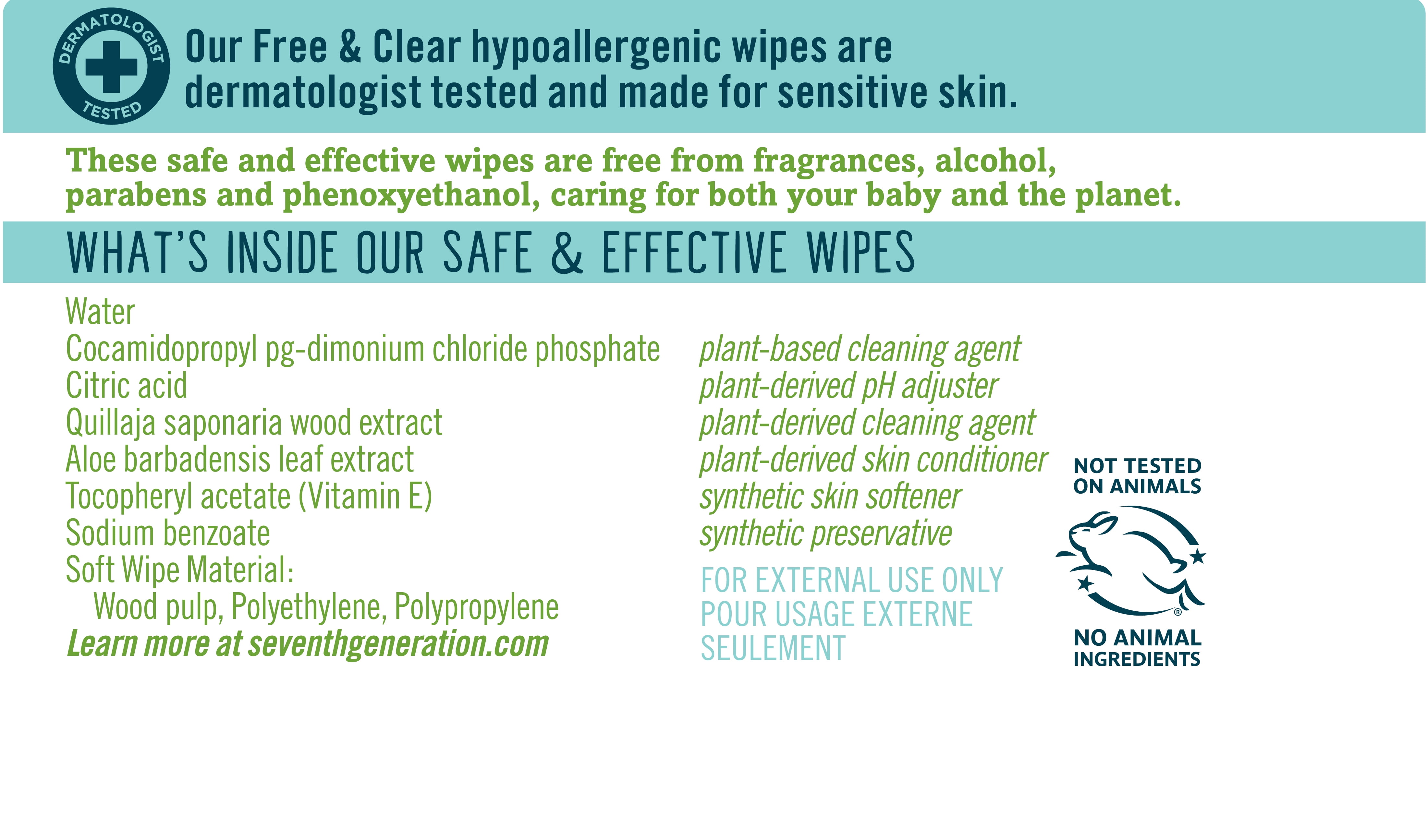 Smooth, soft, and clean – the way a baby’s bottom should be. Seventh Generation Free and Clear Baby Wipes are made for baby’s sensitive skin and contain 0 per cent fragrance, alcohol, parabens, or phenoxyethanol. Our thick, soft wipes are strong enough for big messes while being gentle on newborn baby’s most precious, delicate skin. These baby wipes are moistened with plant-derived skin conditioners like aloe vera and are safe for baby, hands, and face. The tape-seal package design keeps wipes fresh while allowing for easy stacking on nursery shelf and convenient refill for wipe dispensers and warmers. Our hypoallergenic and fragrance free wipes are dermatologist tested and clinically proven to be gentle on baby’s skin. It’s all good, baby. Caring for a little human is a magical undertaking, and we’ve developed an entire line of baby skin care products, wipes, and diapers to bring peace of mind to your journey. For every life-changing milestone, you deserve baby care you can trust.
