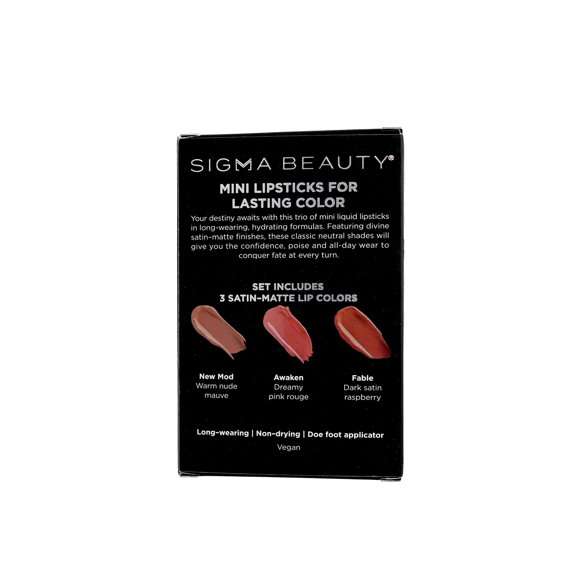 Your destiny awaits with this trio of mini liquid lipsticks in long-wearing, hydrating formulas. Featuring divine satin-matte finishes, these classic neutral shades will give you the confidence, poise and all-day wear to conquer fate at every turn. SHADES INCLUDED: New Mod – Nude mauve Awaken – Dreamy pink rouge Fable – Dark satin raspberry