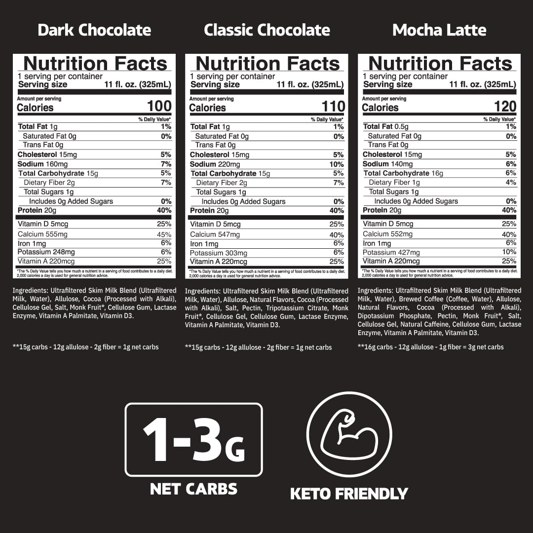 ‘The Power Pack.’ Our Variety Pack comes with our Classic Chocolate Milk, Dark Chocolate Milk, and Mocha Latte (175mg of caffeine). All three delicious lactose free flavors have 20g of protein and 0g of added sugar.
