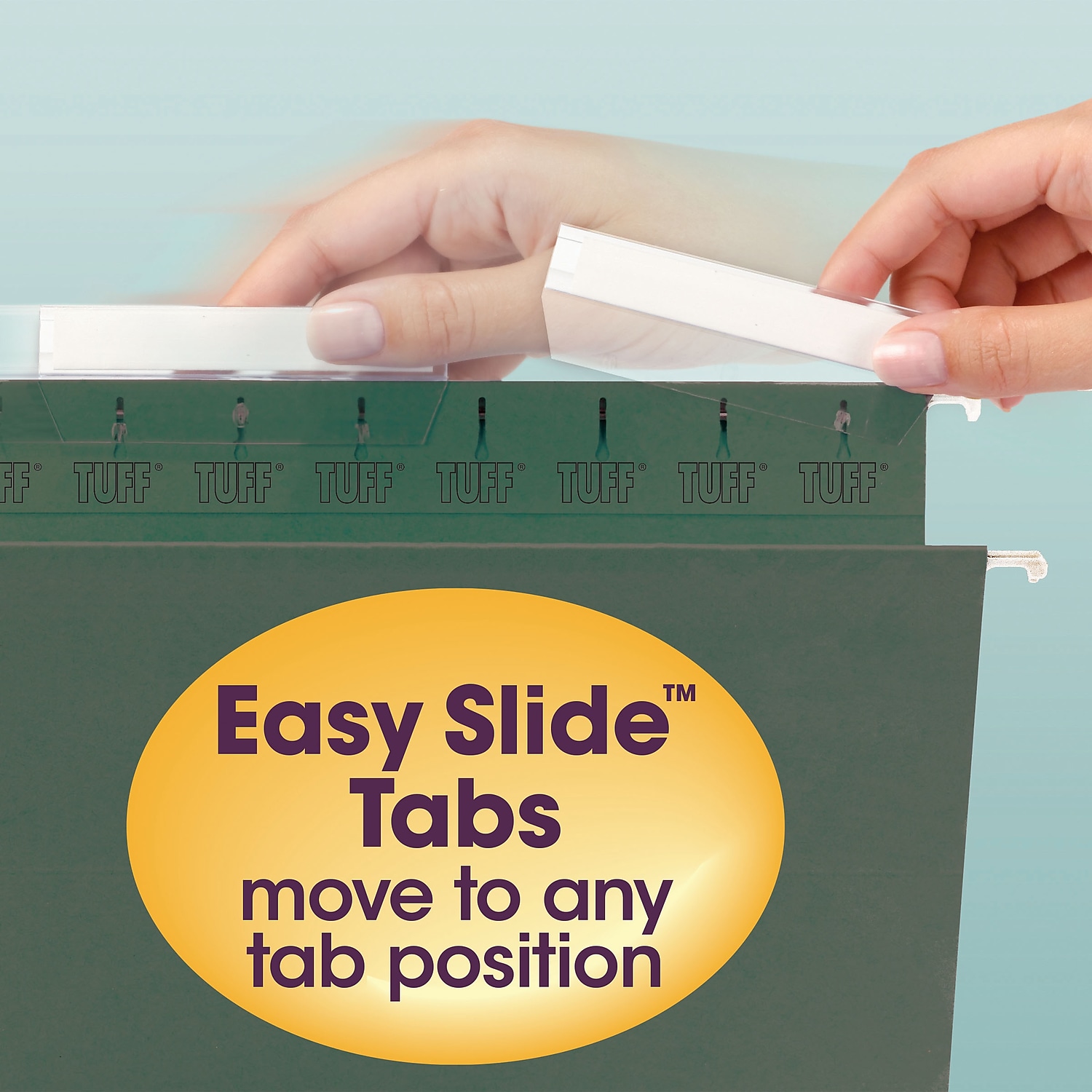 Tuff Hanging Folders feature an Easy Slide Tab and sturdy construction. Specially designed reinforced rods are 40 percent stronger than in standard hanging folders to resist bending and paper tearing. Heavy-duty, oversized 1/3 cut tabs easily slide and secure into the position you choose. Folders are made of 11 point colored stock and include replaceable white tab inserts.