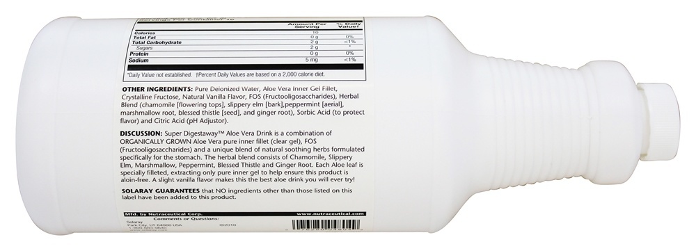 Solaray – Super Digestive Aloe Vera Gel Drink Vanilla – 1 qt. Solaray Super Digestive Aloe Vera Gel Drink Vanilla is a combination of organically grown aloe vera pure inner fillet (clear gel), FOS (Fructooligosaccharides) and a unique blend of natural soothing herbs formulated specifically for the stomach. The herbal blend consists of chamomile, Slippery Elm, Marshmallow, Peppermint, Blessed Thistle and Ginger Root.Solaray Super Digestive Aloe Vera Gel Drink Vanilla is a combination of organically grown aloe vera pure inner fillet (clear gel), FOS (Fructooligosaccharides) and a unique blend of natural soothing herbs formulated specifically for the stomach.? The herbal blend consists of chamomile, Slippery Elm, Marshmallow, Peppermint, Blessed Thistle and Ginger Root.? Each Aloe leaf is specifically filleted, extracting only pure inner gel to help ensure this product is aloin-free.? A slight vanilla taste makes Solaray Super Digestive Aloe Vega Gel Drink the best aloe drink you will ever try!