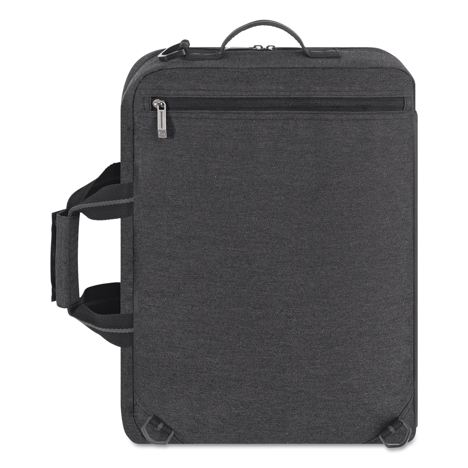 Hybrid briefcase transforms into a backpack to provide an easier way to travel. Padded compartment protects laptops with up to a 15.6" display from damage. Dedicated interior pocket is perfect for securing your iPad, tablet or eReader during travel. Front zippered pocket and front zip-down organizer section offer additional storage for chargers or personal items. Carry this case comfortably by the handles or removable/adjustable shoulder strap. Briefcase is made of a durable, polyester body that’s strong and easy to clean.