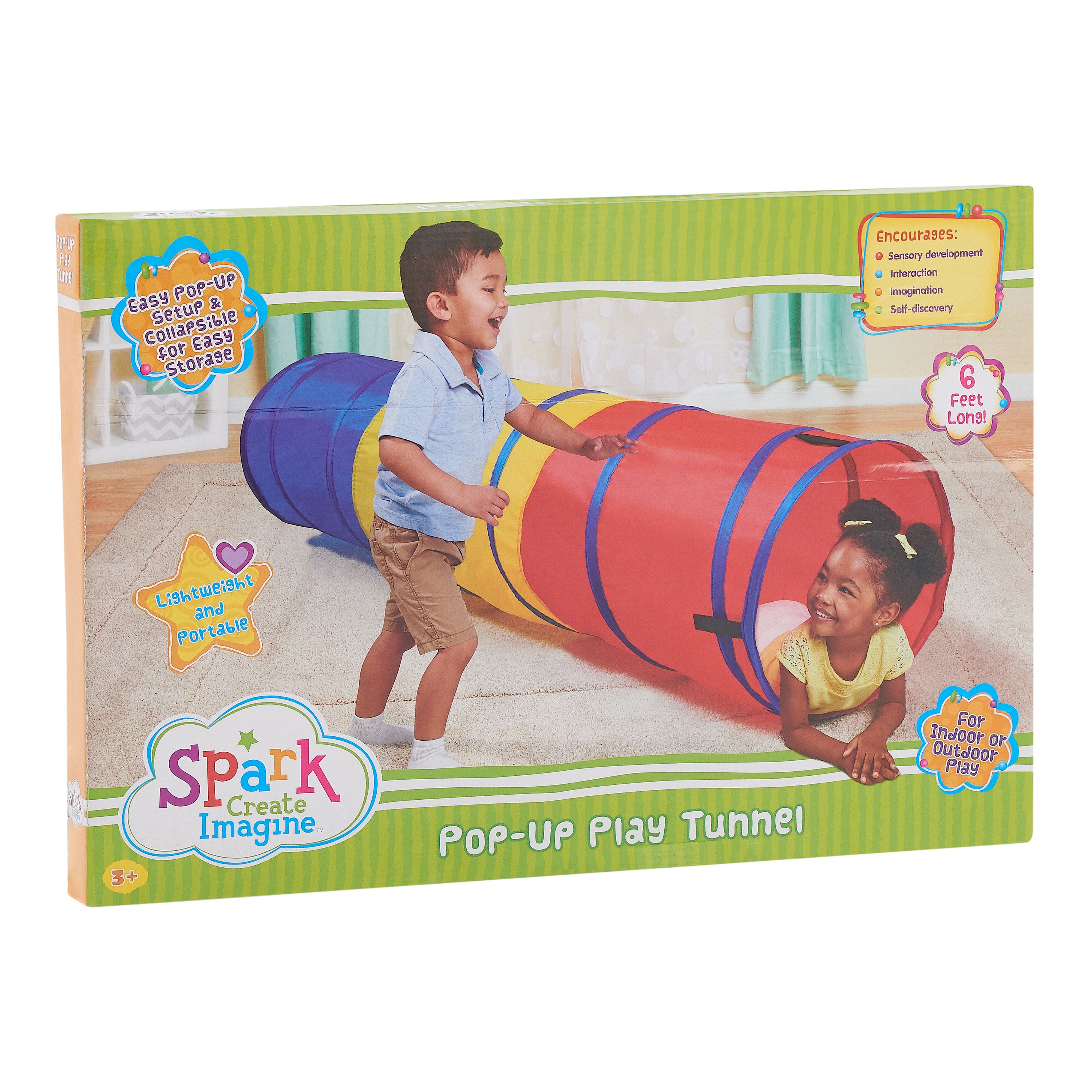 Lightweight and portable, the Spark. Create. Imagine. Pop-Up Play Tunnel adds to the fun where ever you go. This easy to set up, brightly colored tunnel measures six feet long and can be used indoor or out for playtime excitement. Whether they?re crawling back and forth, playing peek-a-boo, or inventing brand-new games, this toy encourages sensory development, interactive and self-directed play, and imagination. Your kids will have fun playing by themselves or with friends. The Spark. Create. Imagine. Pop-Up Play Tunnel is designed for children ages 3 years and up and makes a perfect birthday present, holiday gift or everyday surprise. .