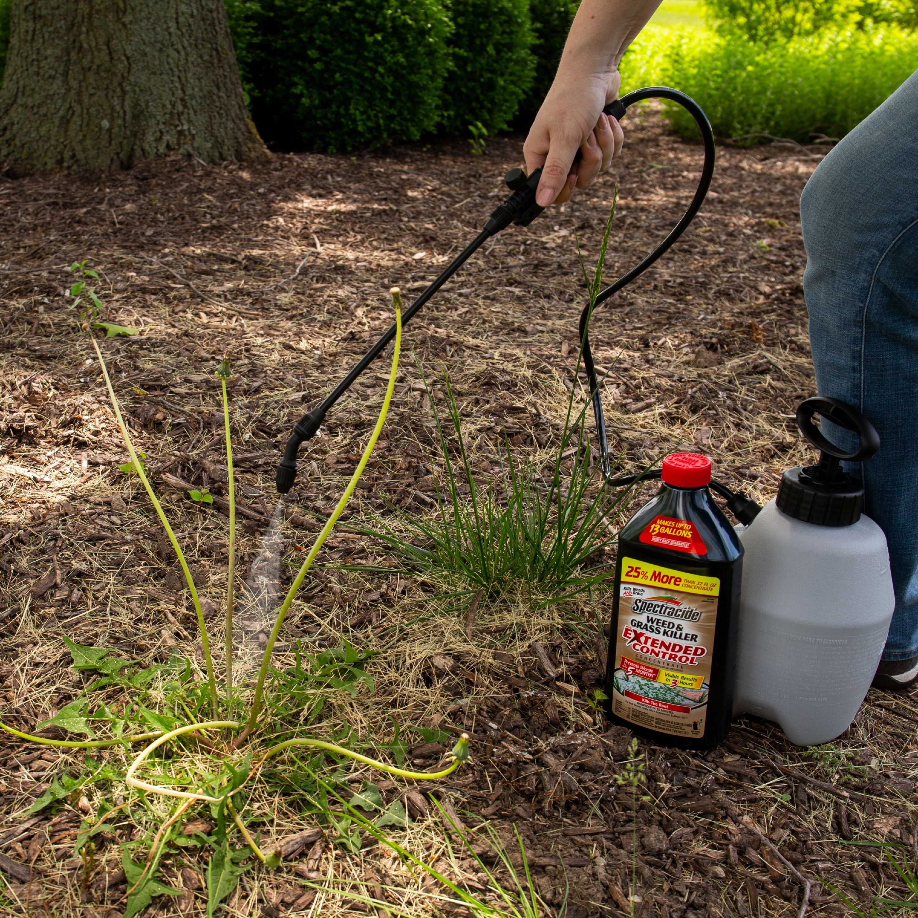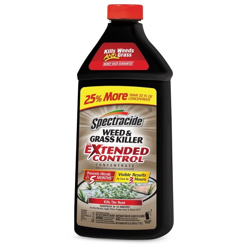 The power is in your hands to keep your landscape in line – unleash it with Spectracide lawn and garden products. Our easy-to-use, fast-acting insect, lawn disease and weed control solutions help you tame lawn and landscape invaders with incredible pest-punishing power. Take command with Spectracide brand. You hold the power. Spectracide Weed & Grass Killer With Extended Control Concentrate is formulated to kill lawn weeds and grass and prevent weed growth for up to 5 months. This quick-kill formula acts fast to kill all types of weeds and grasses down to the root, for visible results in as fast as 3 hours. This product is rainproof in 15 minutes – rainfall or watering 15 minutes after application will not wash away effectiveness. Spectracide Weed & Grass Killer With Extended Control Concentrate is a quadruple-powered weed and grass killing formula, with diquat, fluazifop-p-butyl, dicamba and oxyfluorfen. Use along fences, paths, patios, sidewalks, curbs and driveways and around established ornamental trees, shrubs, flower beds, plantings and buildings. Use for trimming and edging landscapes. Treated areas can be replanted one day later. For best results, apply in warm, sunny weather when the temperature is over 60 degrees. Do not use in areas that will be planted or seeded within 3 months. See label for complete instructions. Mix Spectracide Weed & Grass Killer With Extended Control Concentrate with water at the rates directed. For use with tank sprayers.