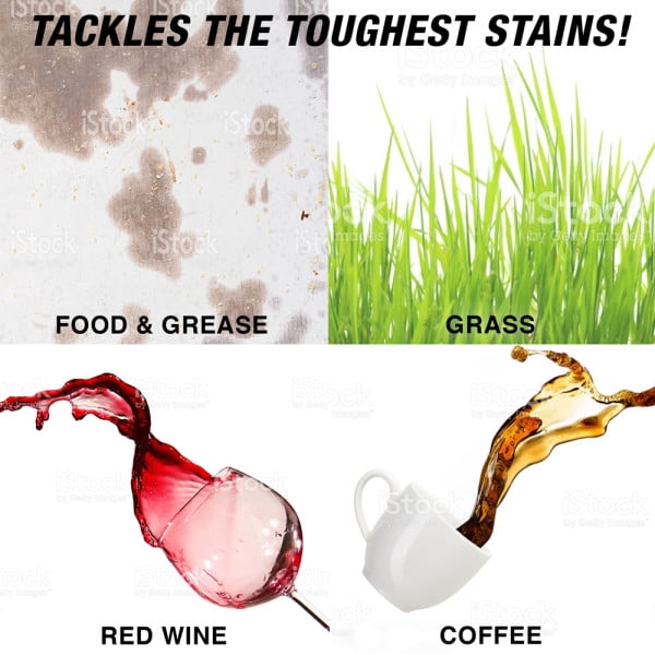 - Better on everyday stains vs detergent alone.