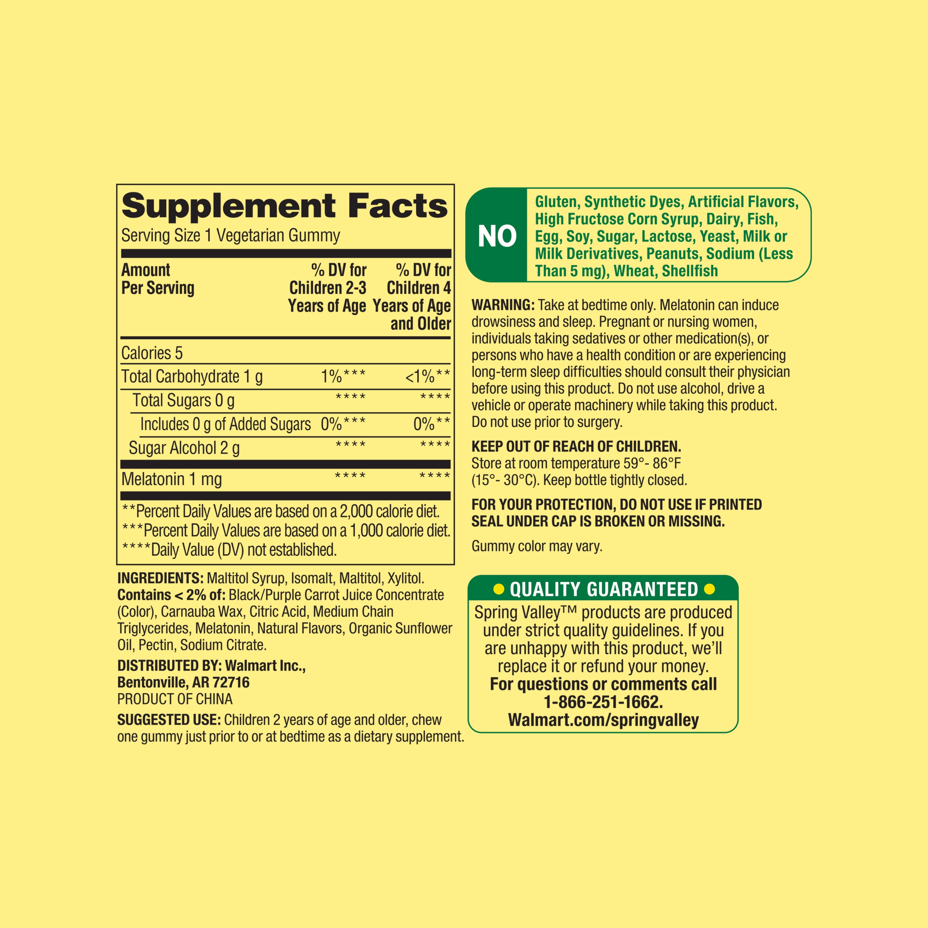 Our Spring Valley Zero Sugar Kids Melatonin Gummies are an easy way for kids to get the sleep support they need.* Each gummy delivers one milligram of melatonin. Melatonin is a naturally occurring compound that is produced by the body and has been associated with normal body rhythms and sleep/wake patterns.* These gummies feature delicious natural blackberry and raspberry flavors along with other natural flavors. They are vegetarian and sugar- and drug-free. Children two years of age and older should take one gummy prior to or at bedtime to help promote normal sleep patterns and rhythms.* You can rest assured that these gummies are produced with strict quality guidelines and is backed by our quality guarantee. Help your kids sleep better with the Spring Valley Zero Sugar Kids Melatonin Gummies.