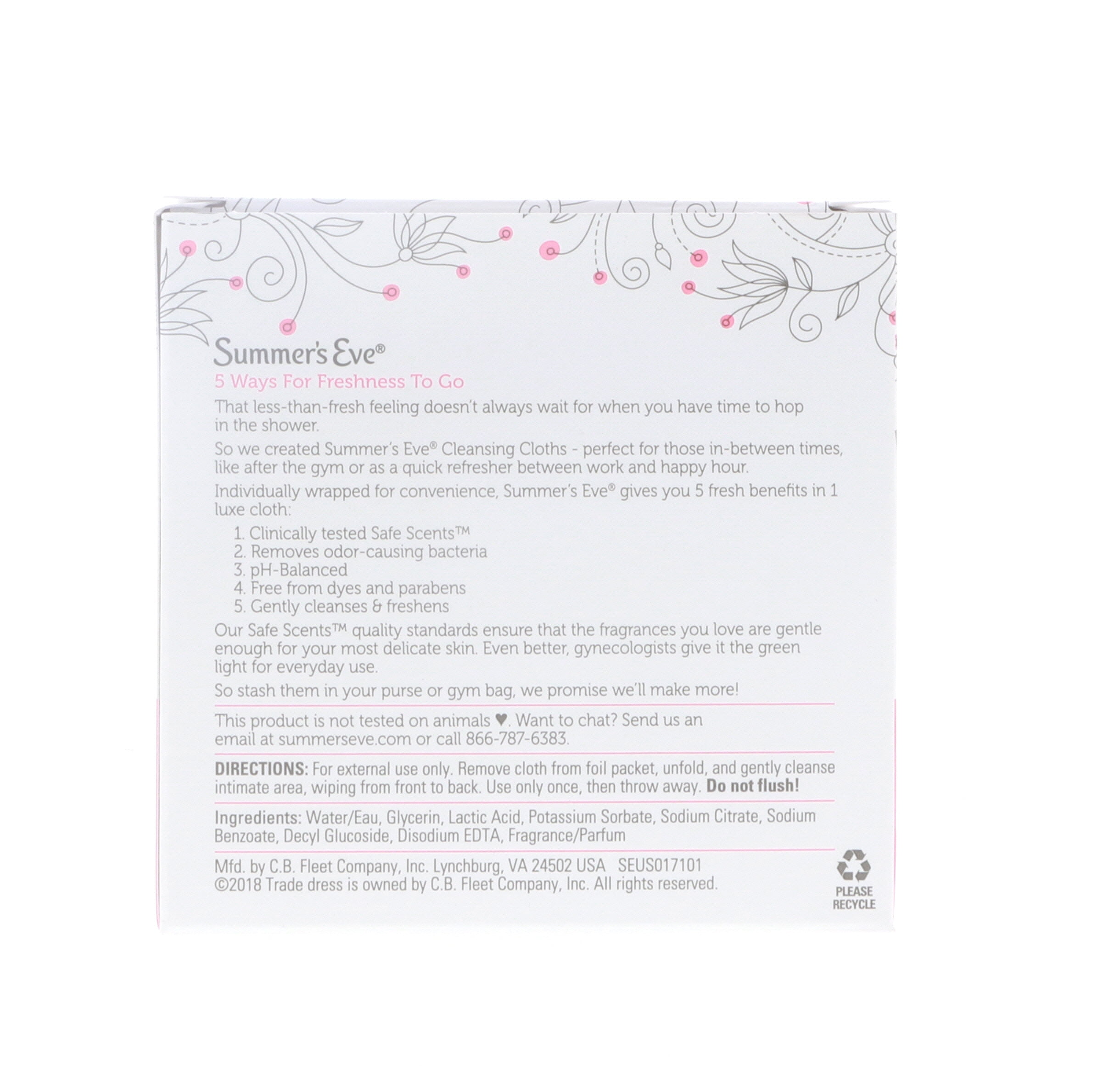 Gynecologist developed and tested.Feminine CleansingC.B. FleetActive Ingredients:Purified Water; Octoxynol-9; Citric Acid; Sodium Benzoate; Tocopheryl Acetate; Aloe Barbadensis Leaf Juice; Neutresse (Odor Synthesis); Disodium EDTA; Fragrance; Sodium Sulfite; Ascorbic Acid; Potassium SorbateFor external use only. Remove cloth from foil packet, unfold, and gently wipe from front to back. Use only once and throw away, or flush one at a time.Uses:Feel clean and fresh – at home or on-the-go! Summer’s Eve Feminine Cleansing Cloths are specially formulated for sensitive skin and fit discreetly in your pocket or purse. Controls odor: Gently cleanses to remove odor-causing bacteria. Safe and gentle: Alcohol-free so you don’t have to worry about dryness and irritation. Hypoallergenic, gynecologist tested, individually wrapped.