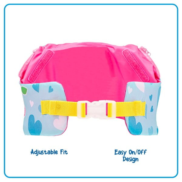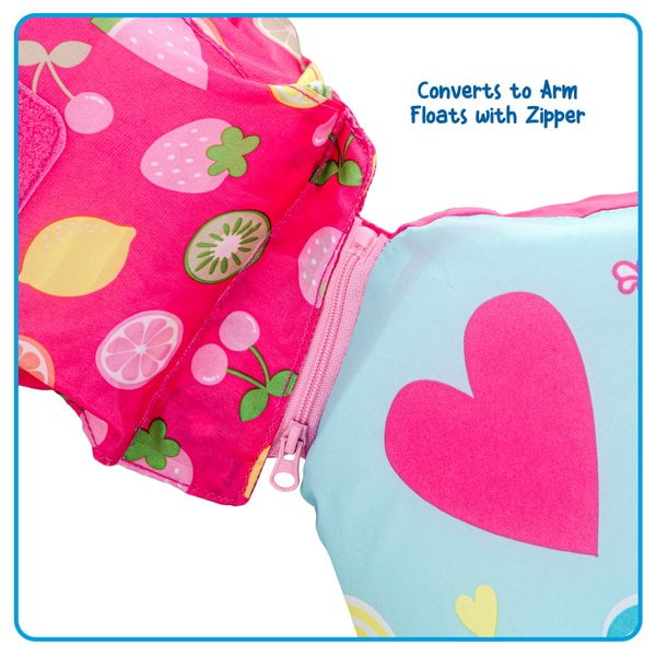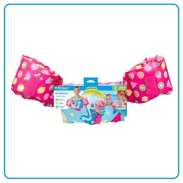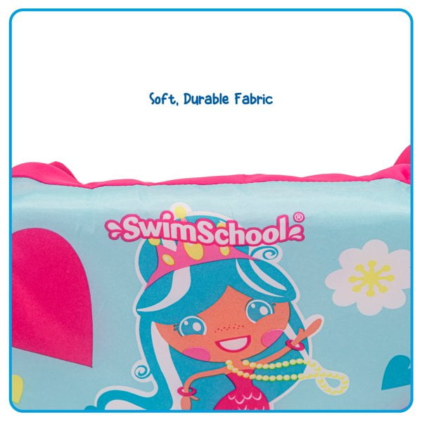 The Pink Mermaid 2-in-1 Swim School Tot Swimmer encompasses a unique swim training system to grow with your child as they become more comfortable in the water. Promoting Swim Skills is the first step and includes a buoyant swim trainer vest with arm floats for greater mobility. The swim vest provides supportive buoyancy and balanced flotation allowing kids to safely practice swimming and explore the water. Fun prints and bright colors mean that your budding swimmer will always be highly visible while splashing in the pool. The 2-in-1 Tot Swimmer is recommended for children between the ages of 4 and 6 with a maximum weight of 50 lbs.