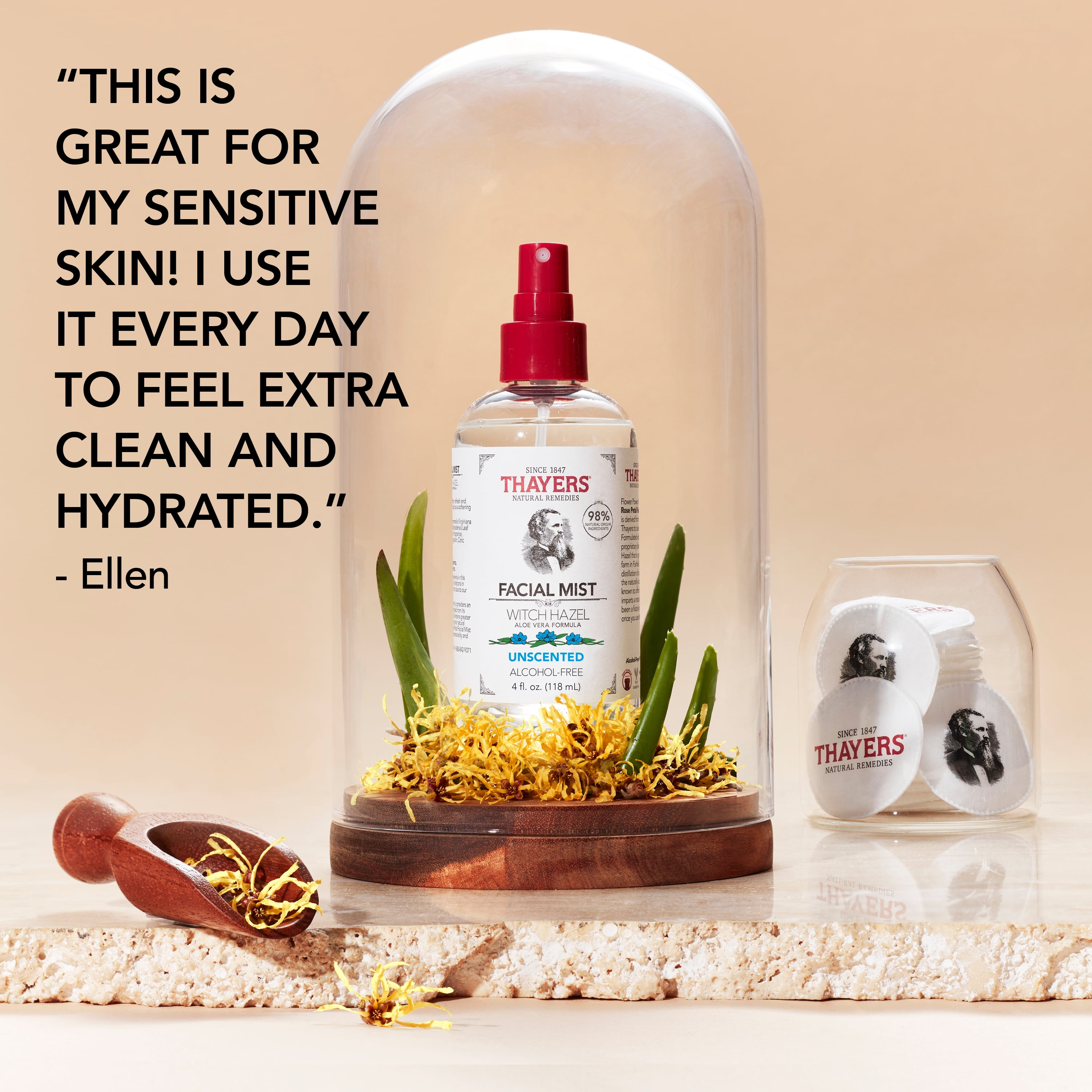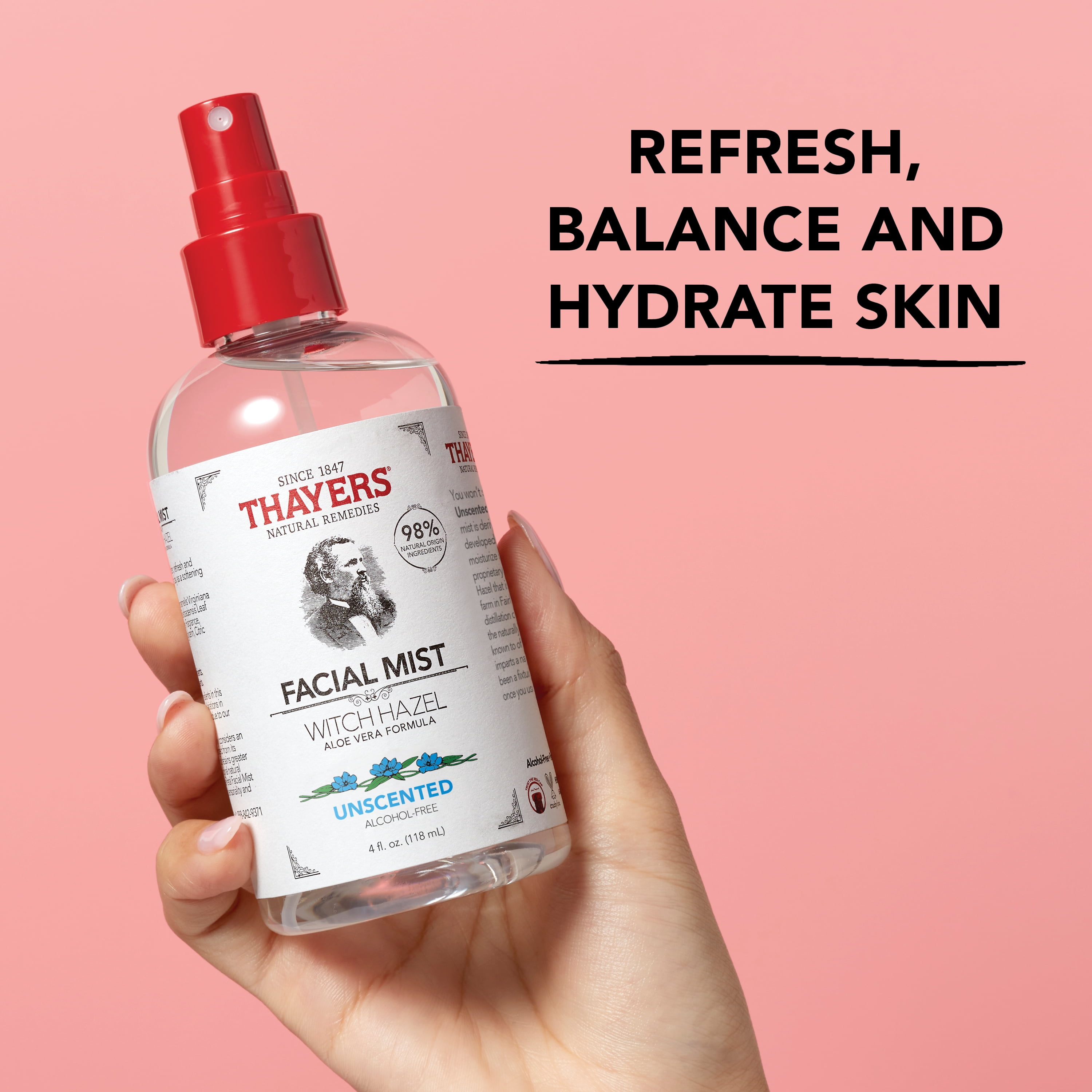 You won’t smell it, but you’ll surely feel THAYERS Unscented Face Mist. This pH balanced, hydrating face mist is derived from a time-honored formula, developed by Thayers to cleanse, tone, and moisturize skin. Formulated with our unique, proprietary blend of Aloe Vera and non-distilled Witch Hazel that is grown exclusively for Thayers on a family farm in Fairfield County, Connecticut. By avoiding distillation of our Witch Hazel, we’re able to preserve the naturally-occurring, beneficial tannins which are known to offer antioxidant benefits. Our face mist formula imparts a natural glow to your skin. Thayers elixirs have been a fixture in medicine cabinets for generations – once you use them you’ll know why.
