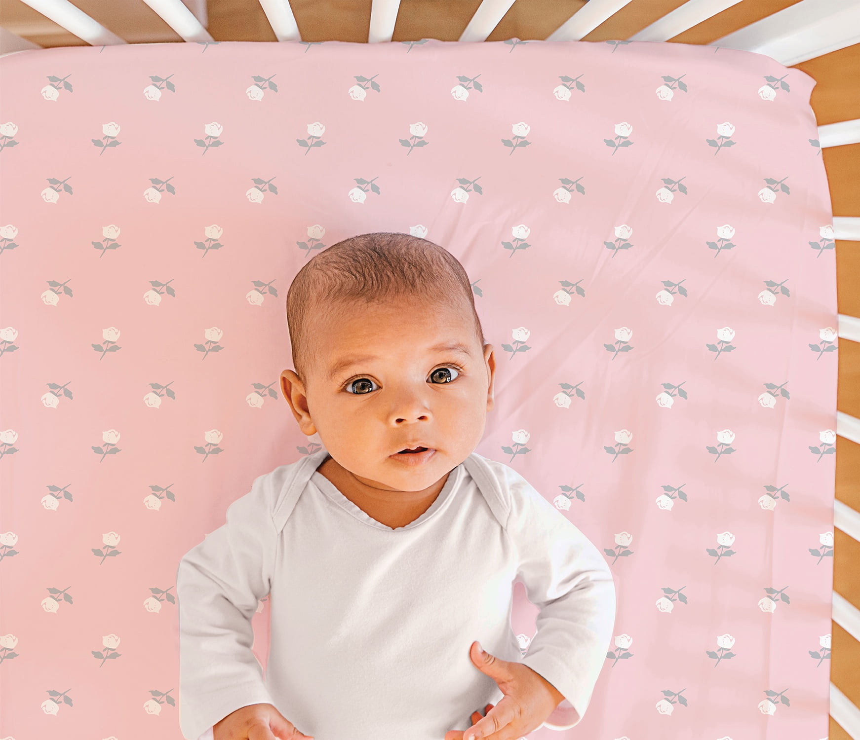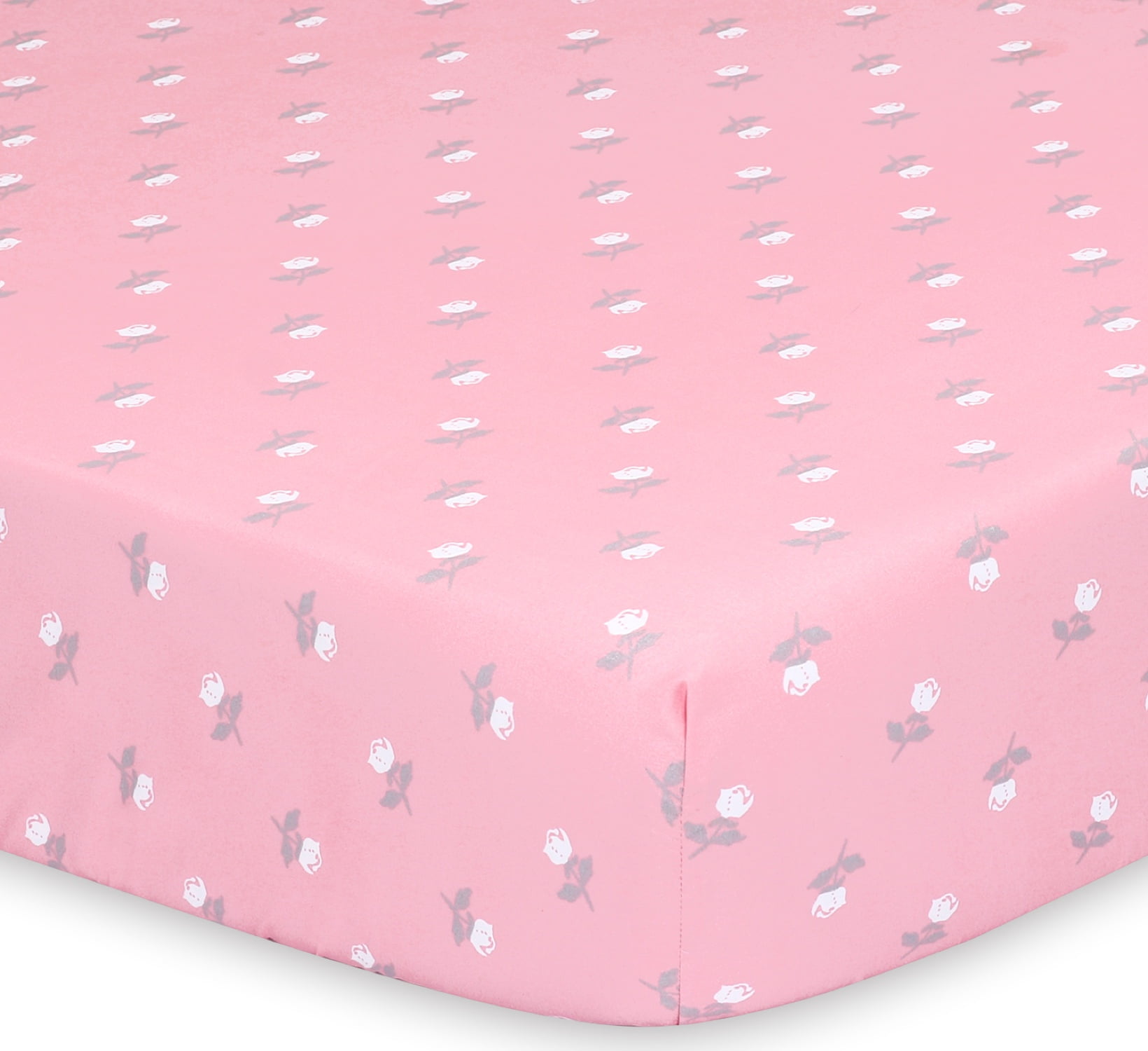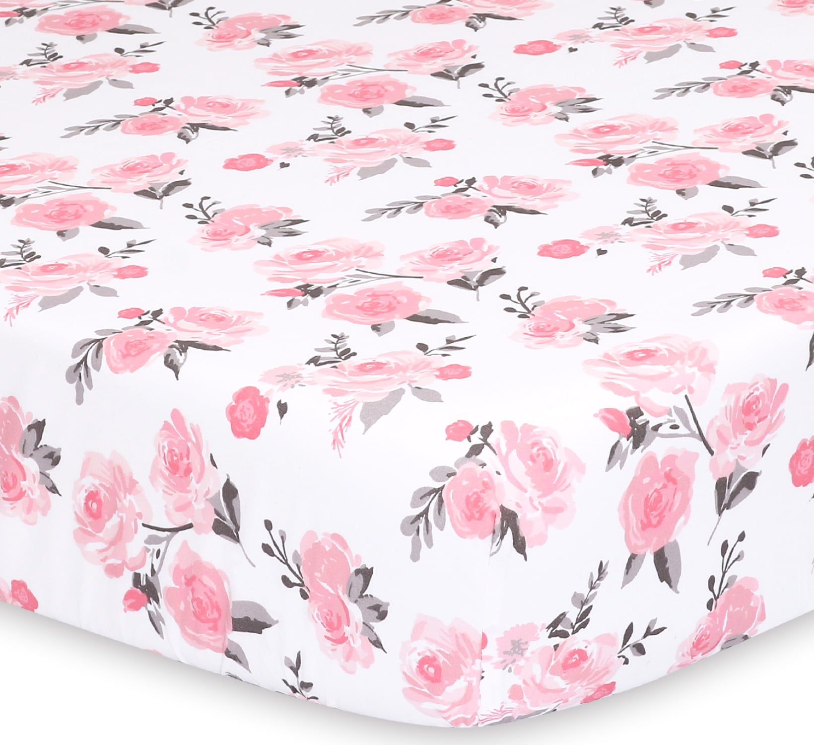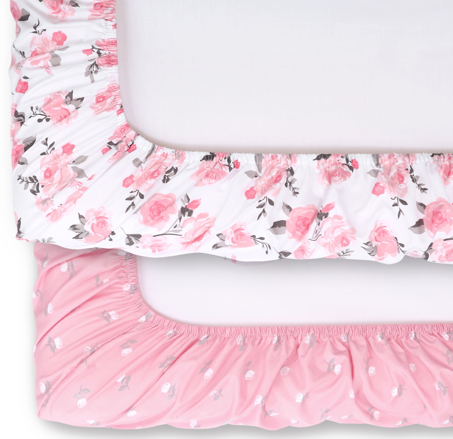 The Peanutshell fitted crib sheet set in pink roses and ditsy floral is the perfect addition to your baby girl’s nursery. In shades of pink, grey, and white, these two sheets will surround your baby girl with softness. The first sheet is a sophisticated watercolor print, while the second is a sweet all-over ditsy print. Microfiber fabric is comfy soft and the easiest of care. Pack of two allows for quick changes.