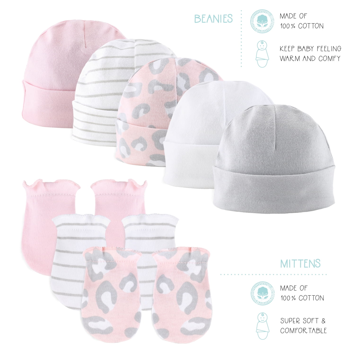 - Newborn baby layette accessories 5 hats, 3 pairs of mittens, 3 burp cloths, and 4 30"x30" blankets