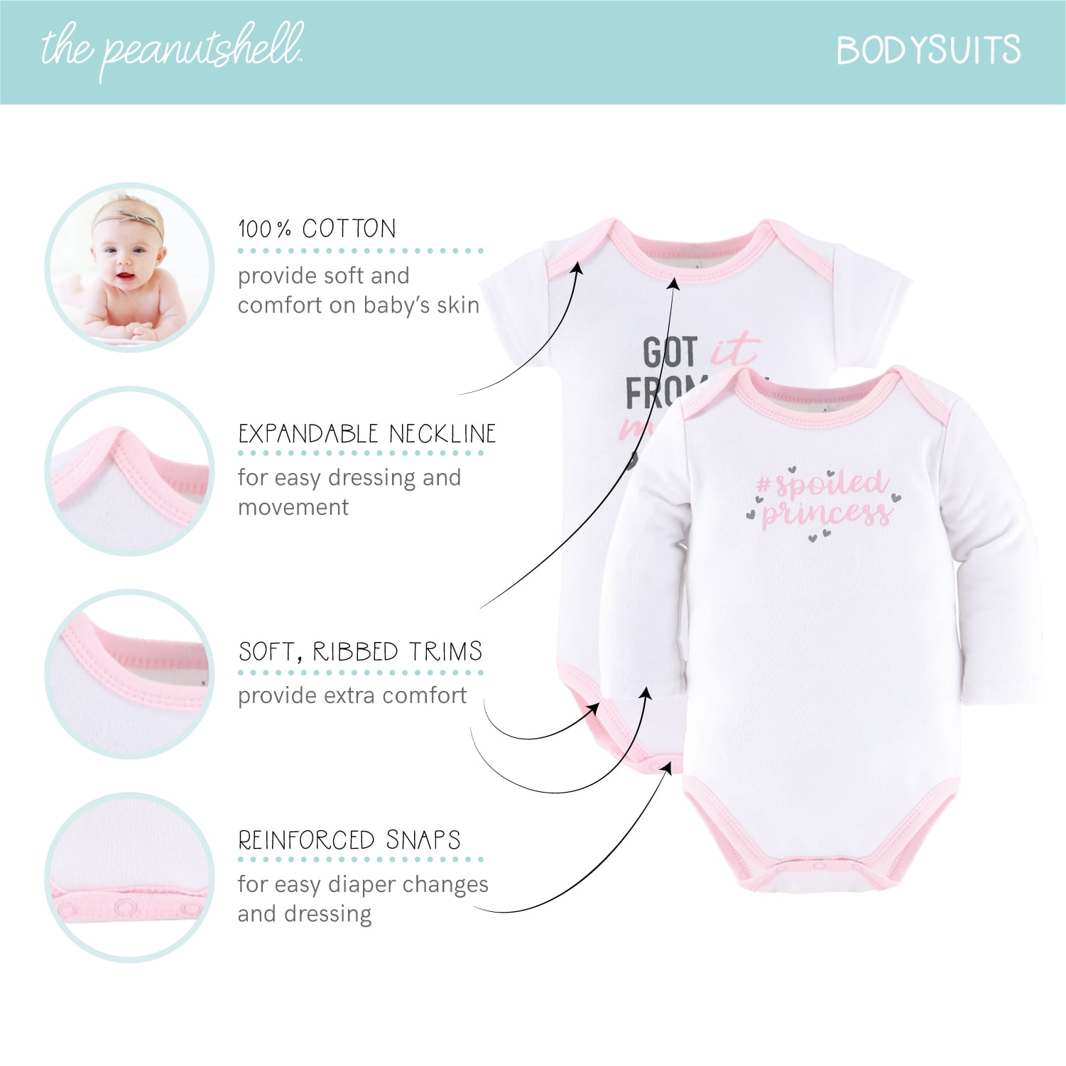 The Peanutshell Newborn Baby Layette Gift Set for Girls includes the perfect assortment of newborn baby clothing and other essentials that all new parents need to welcome baby home! This must-have set of essential newborn items makes a thoughtful and much appreciated baby shower gift. Made of soft 100% cotton, this 23 piece newborn baby gift set includes receiving blankets, burp cloths, beanies, mittens, long sleeve bodysuits, short sleeve bodysuits and a baby sleep sack – all in beautifully coordinated colors and patterns. Newborn baby clothing items include essential features to care for baby – expandable necklines, soft ribbed trim, reinforced snaps, soft ribbed cuffs and zipper pull guard. Newborn receiving blankets and baby burb cloths are super soft to comfort and keep baby warm and cozy. Machine wash and dry for easy care.