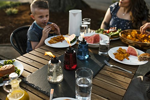 Few things are as enjoyable as dining outside with family & friends. Next time you dine al fresco, gather everyone around your table to experience the warm glow of natural flame lighting. A TIKI Brand molded glass tabletop torch makes a perfect centerpiece to illuminate your table & your conversations. Group more than one together to create a striking focal pt. Or use individually as colorful accents on tables around your yd or patio. Each 12 oz fill delivered to 5 hours of burn time when used with TIKI Brand torch fuel. Available in Rio red, key Lime green, & ocean blue glass (each sold separately), the modern design of these table torches looks great with any style of decor. TIKI Brand molded glass tabletop torches are sold separately & come with the 6" tall glass vessel, a long-lasting fiberglass wick, & a metal snuffer to extinguish the flame at the end of the night. TIKI Brand torch fuel sold separately.
