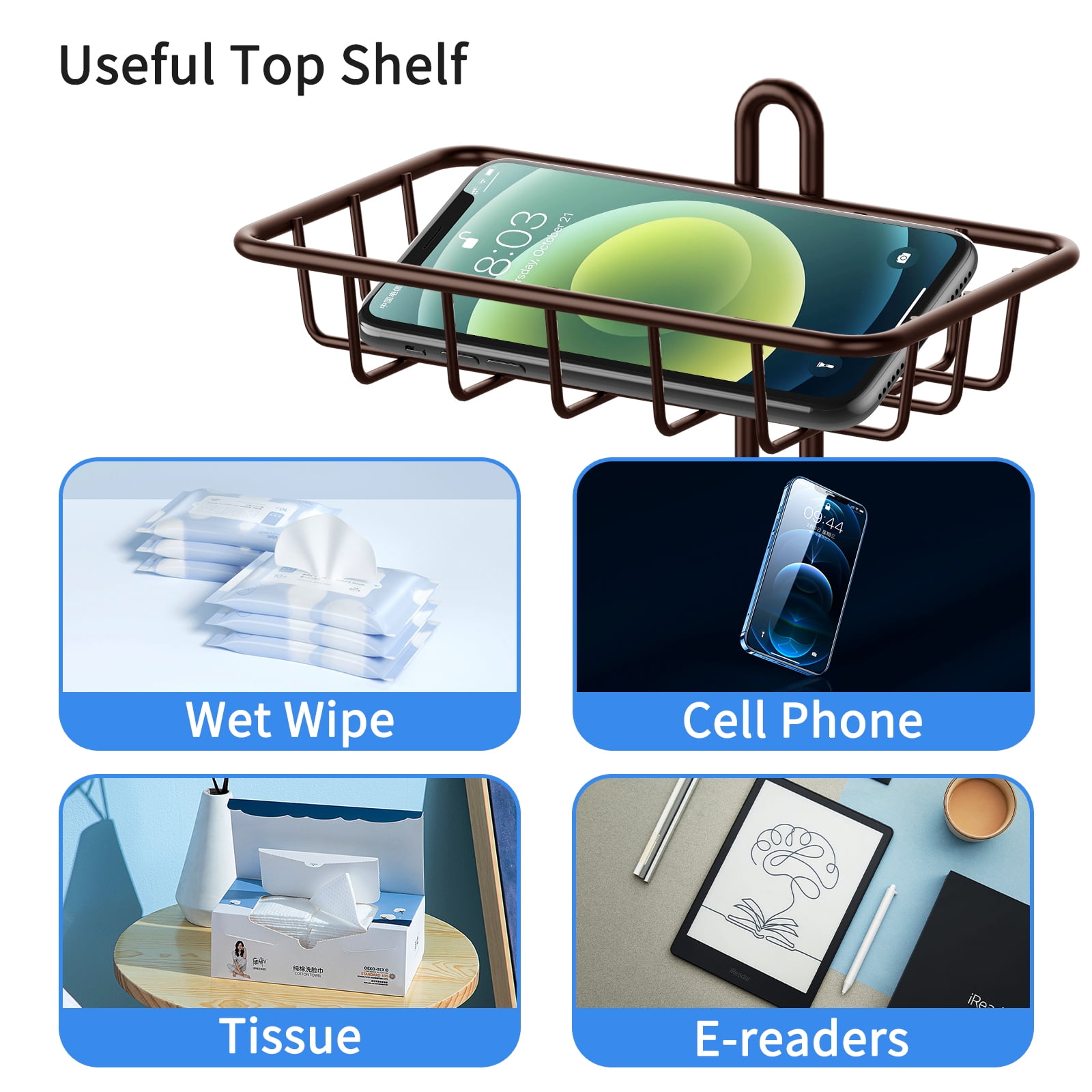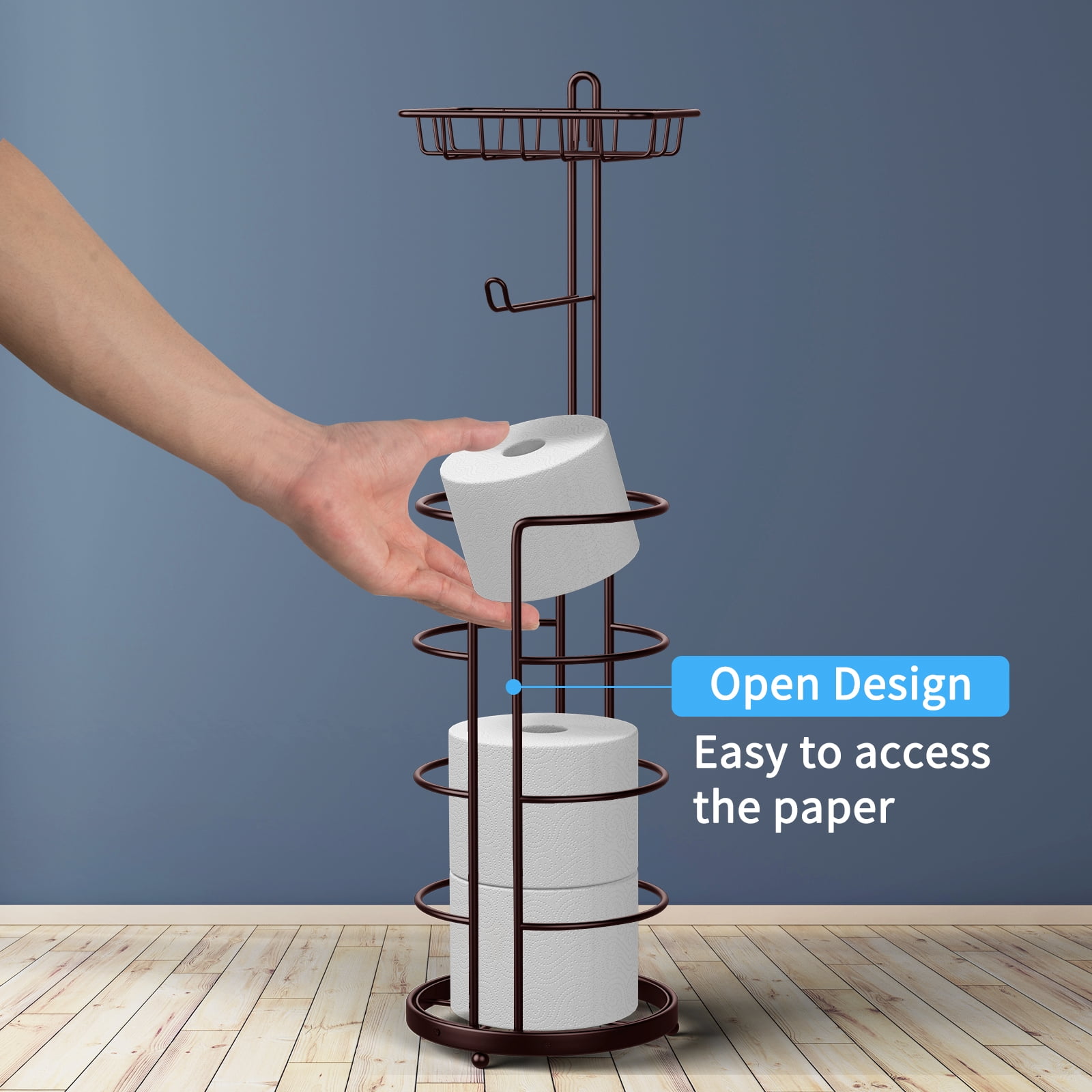 - [EXTRA STORAGE] Never be without toilet paper again! This toilet paper holder stand dispenses one toilet tissue paper and keeps 3 more. The toilet paper dispenser holders also equipped with a top shelf that adds extra storage space for cell phone or baby wipes.