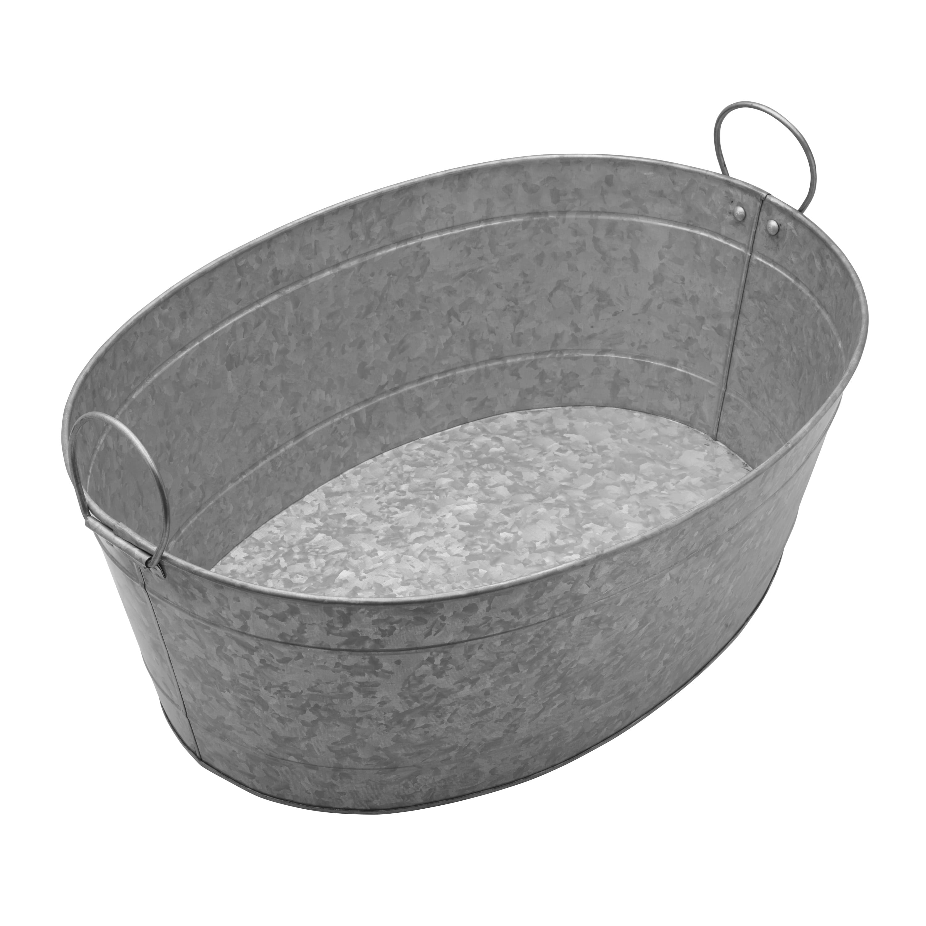 This Large Galvanized Metal Beverage Tub can be used to hold ice or as a wine, beer, or soft drink chiller. This large 25-inch oval tub is perfect for birthday parties, backyard BBQs or any gathering with family and friends. This piece is crafted in heavy duty galvanized metal for a vintage weathered look, with handles for easy carrying. Beverage tub measures 25-inches long by 18-inches wide and 9-inches high. Hand wash with warm water and mild detergent; rinse and towel dry.