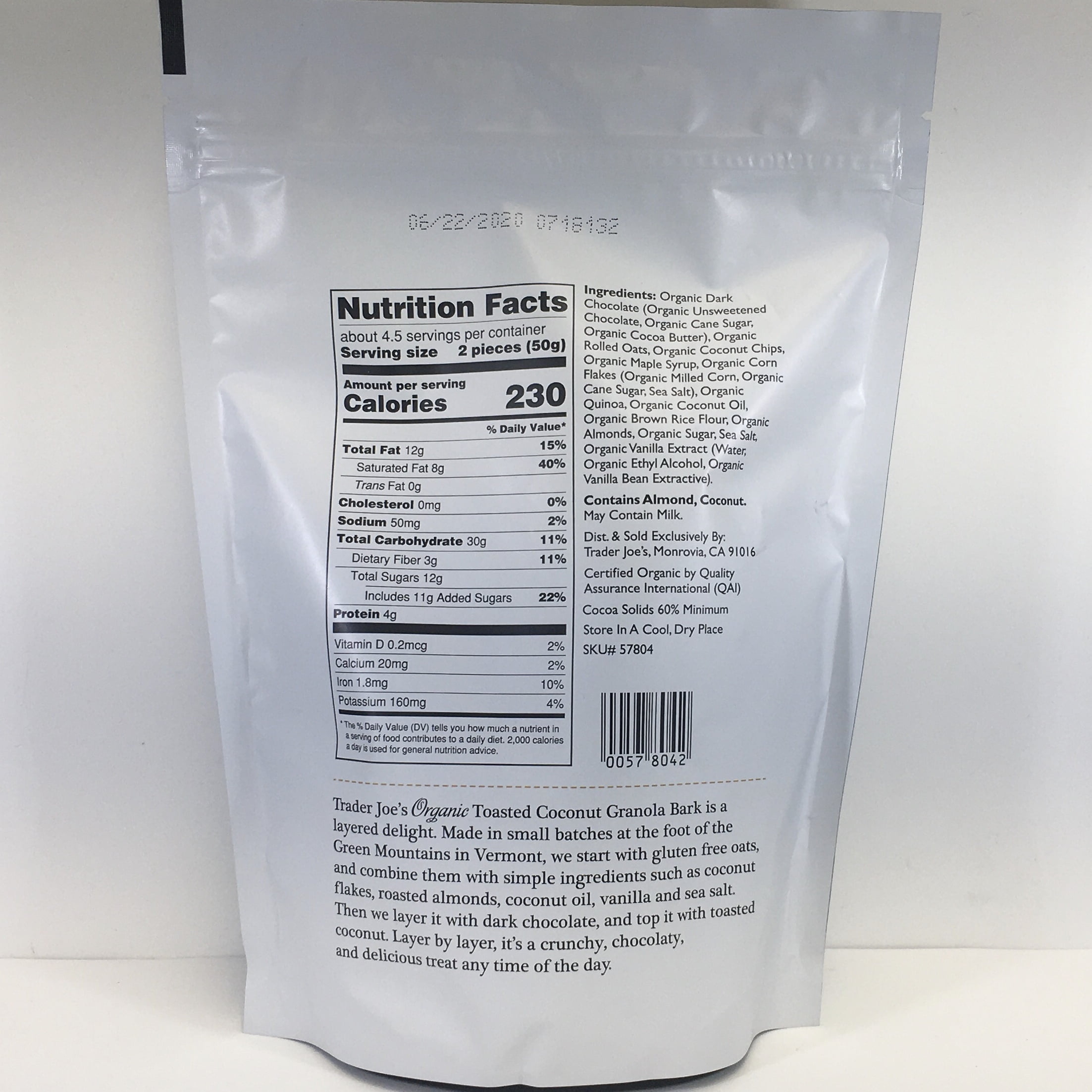 Gluten Free Organic Toasted Coconut Granola Bark is crunchy granola layered with dark chocolate and sprinkled with toasted coconut chips. Layer by layer, it’s a crunchy, chocolaty, and delicious treat any time of the day.Trader Joe’s Organic Coconut Granola Bark Gluten Free