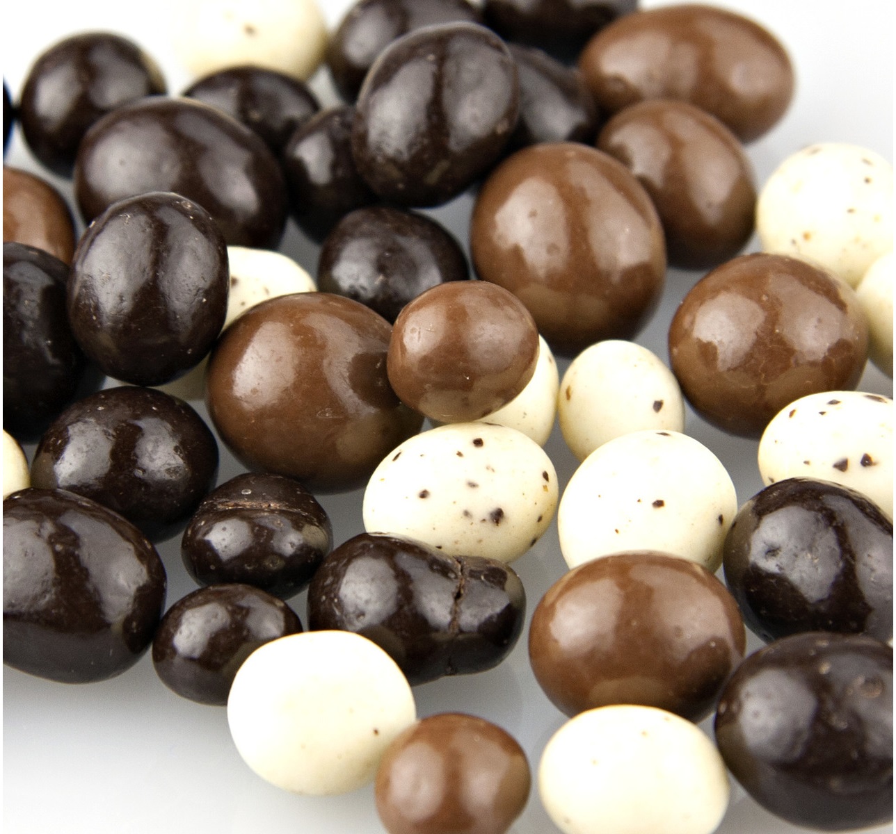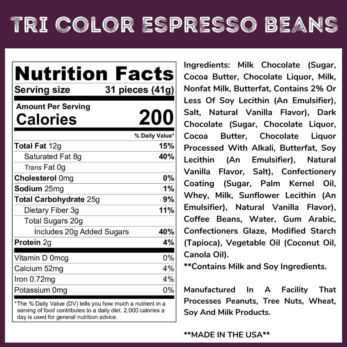 Triple the fun to satisfy all your cravings at once! These coated coffee beans combine 3 different coatings, milk chocolate, dark chocolate, and coffee-cream flavored.