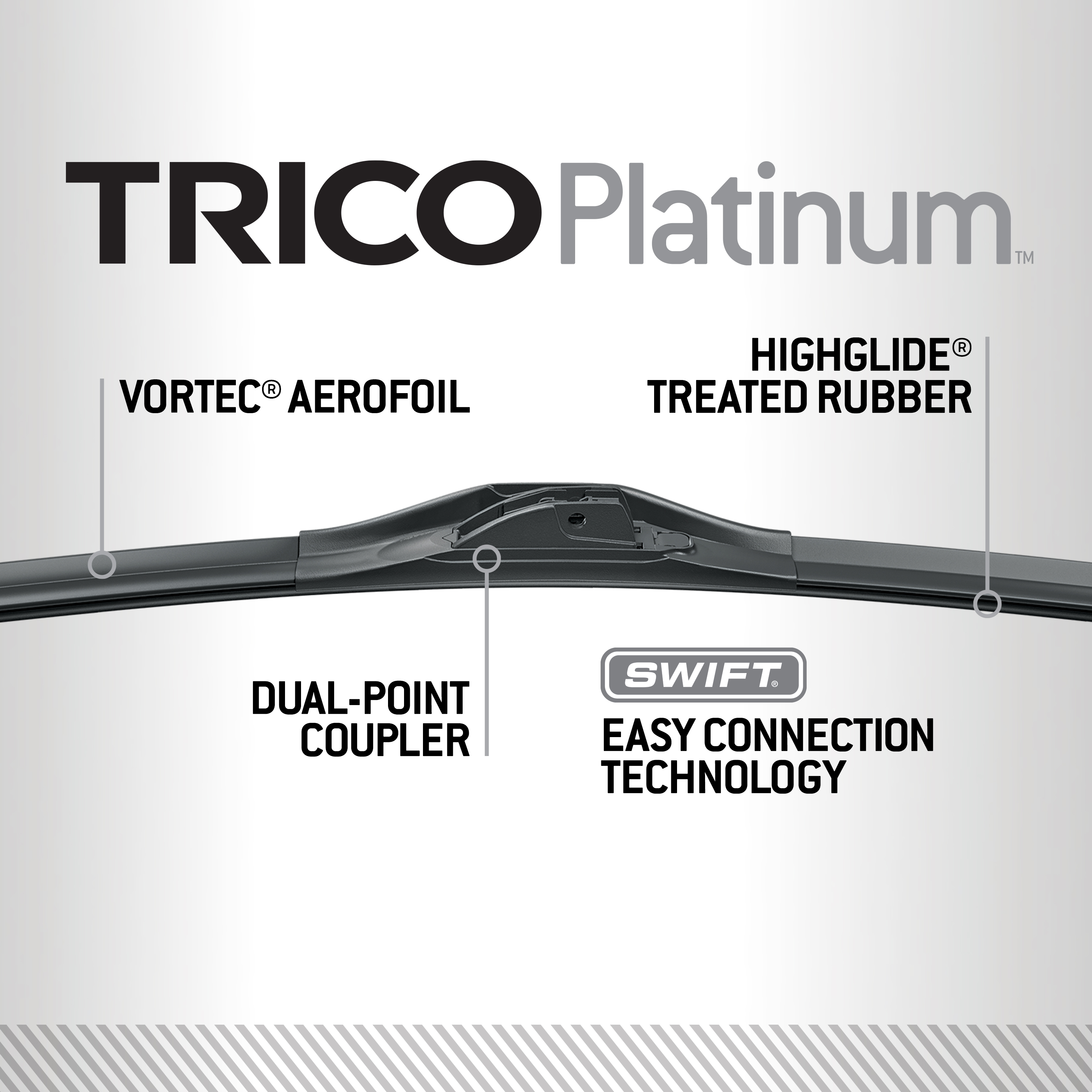- High Wind Performance: Trico Platinum features a patented swept-wing spoiler that slices through wind speeds in excess of 135 mph (220 kph).