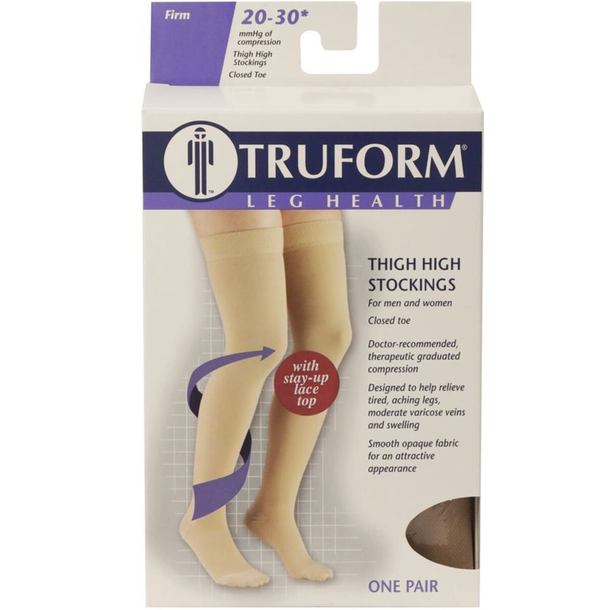Truform 8867, Medical: Designed to help relieve moderate conditions associated with poor circulation. Truform medical stockings feature classic styling and a smooth knit texture fabric that conceals unsightly blemishes. Color options are basic neutrals for all-occasion wear. For men & women; features a silicone lace top to help keep stockings in place without a garter belt or liquid adhesive. Helps in the treatment of:Tired, aching legs. Moderate varicose veins. Moderate leg, ankle and foot swelling. Post surgery.